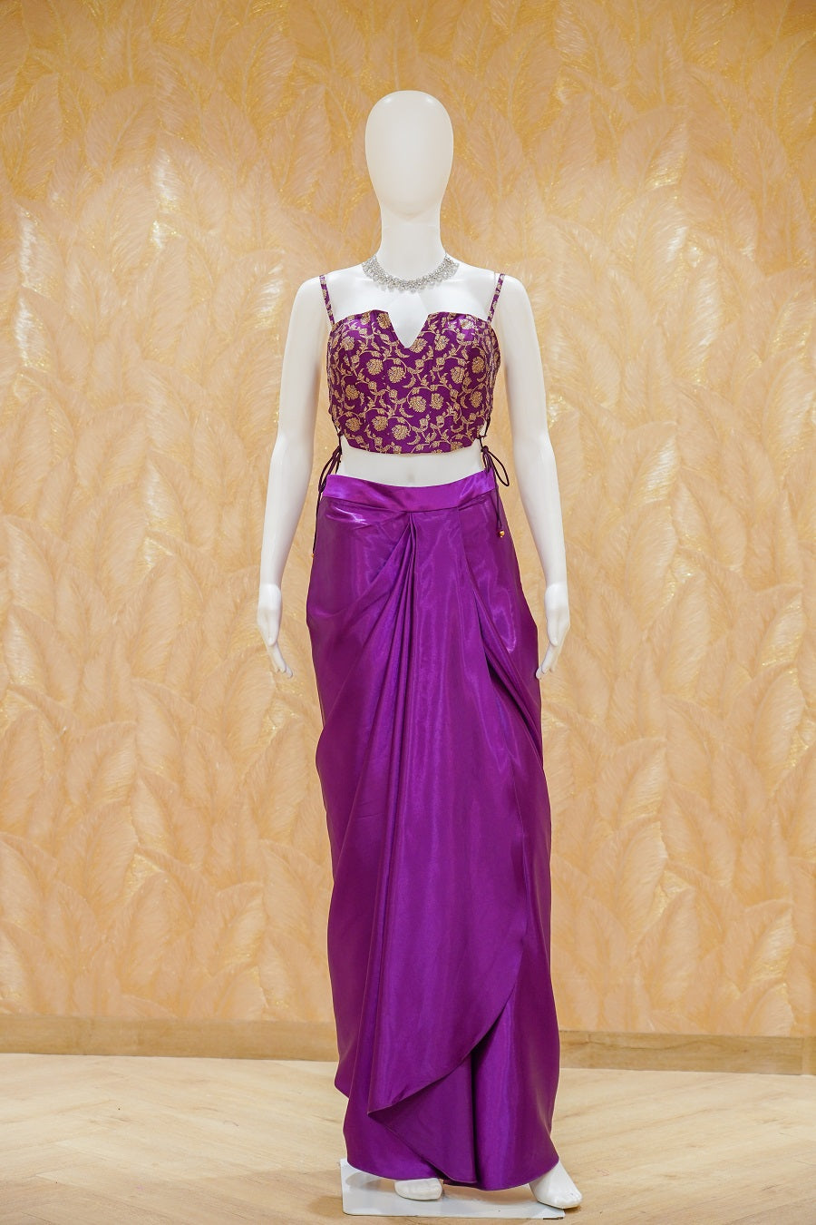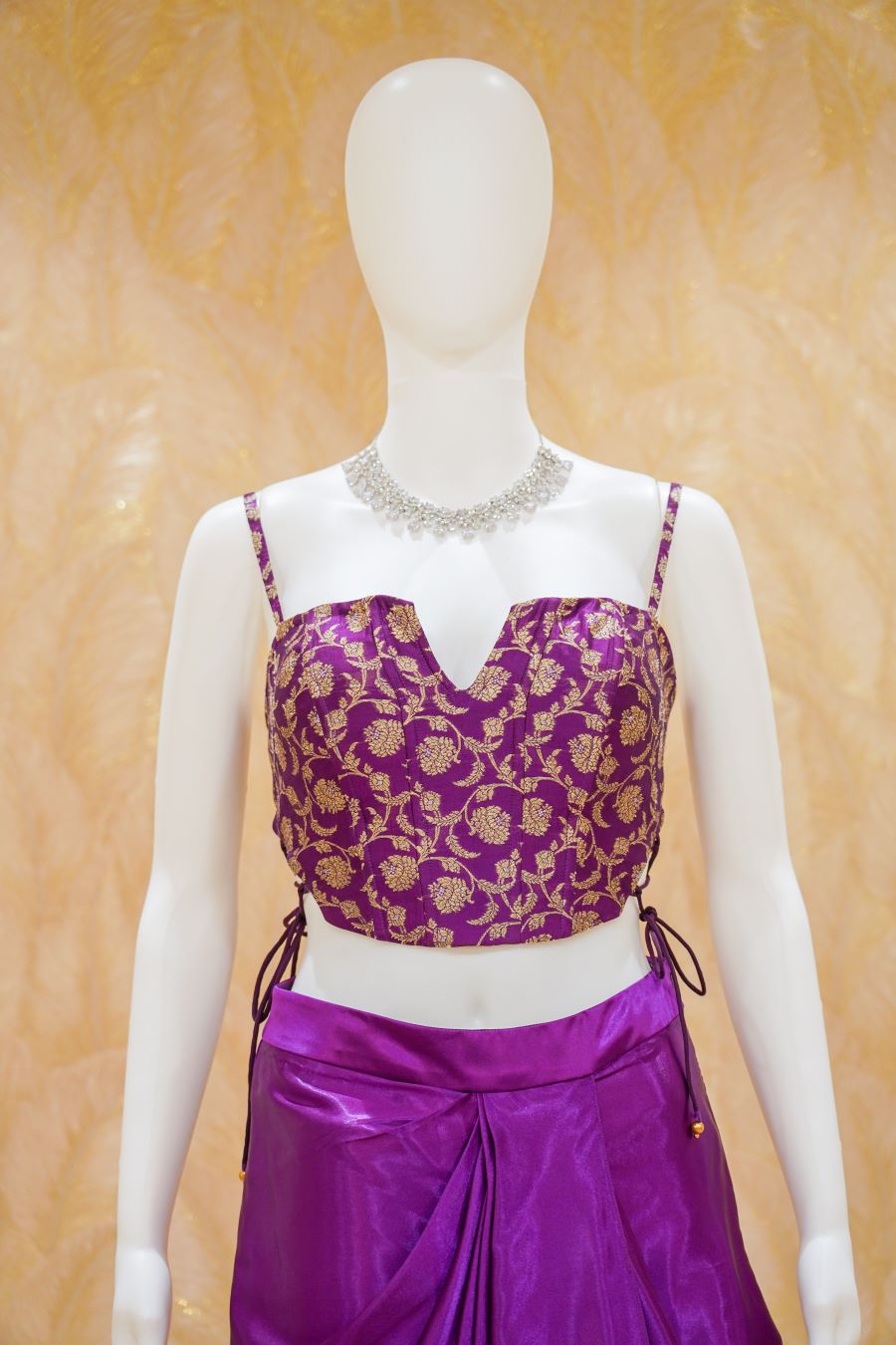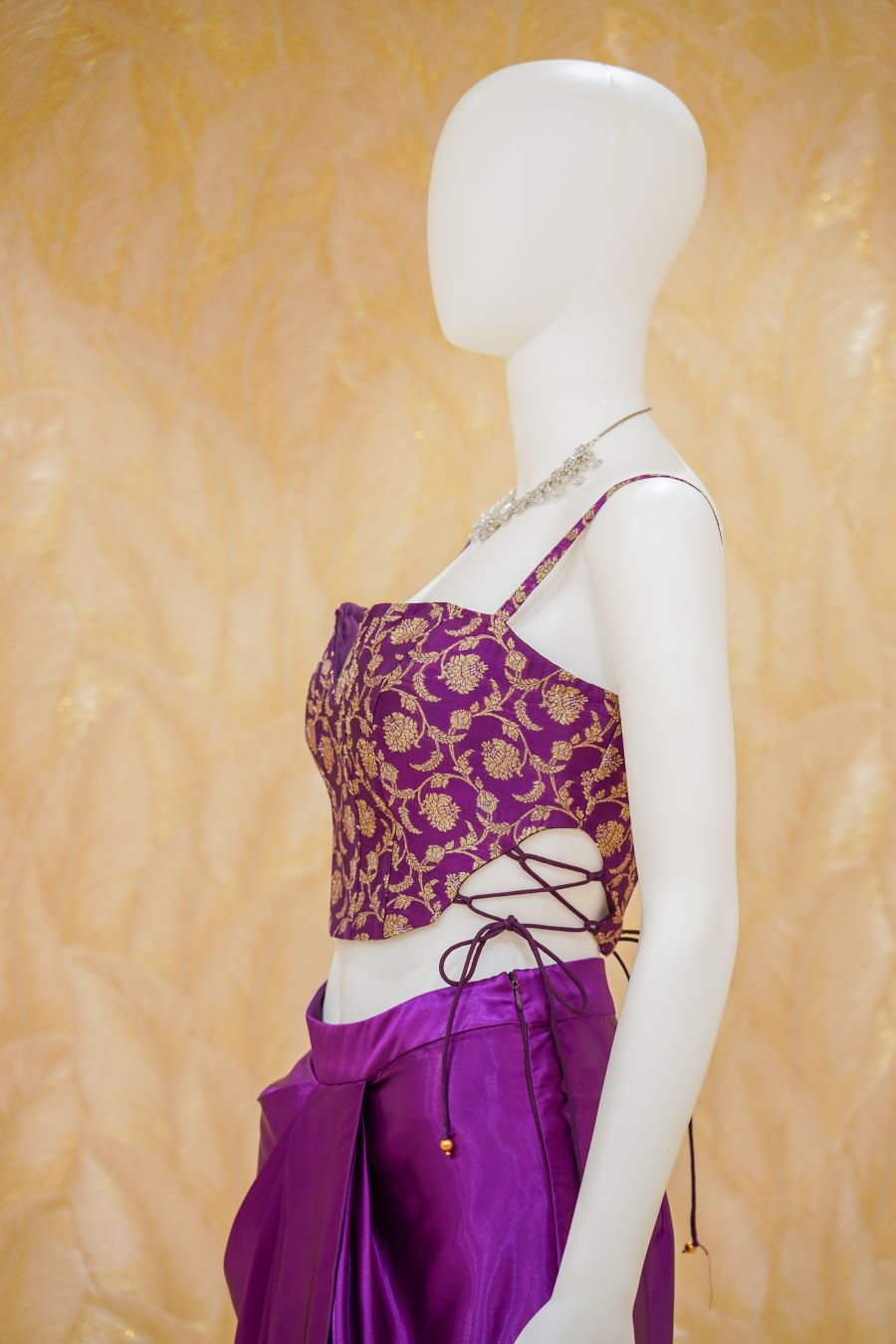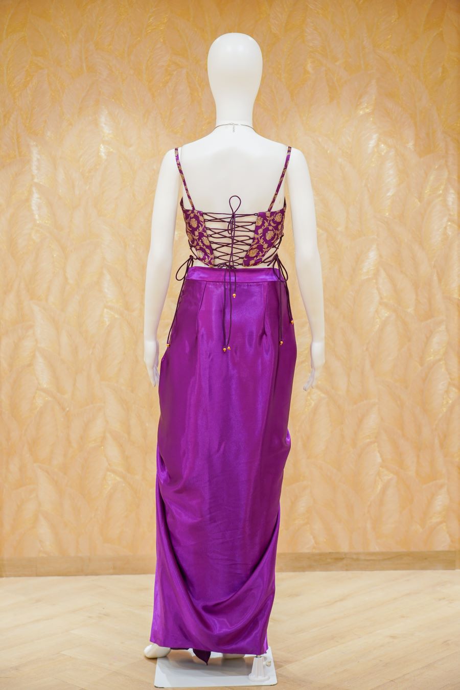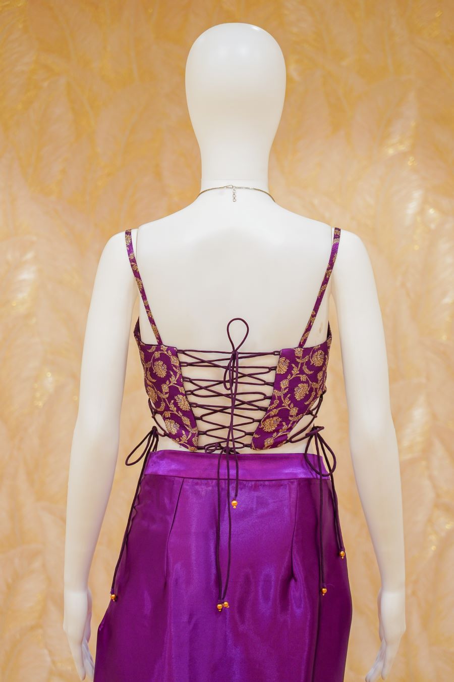 Drape skirt set comes with purple satin, cris-cross banarasi brocade corset, adding to its charm. Model is wearing size, “Medium”.