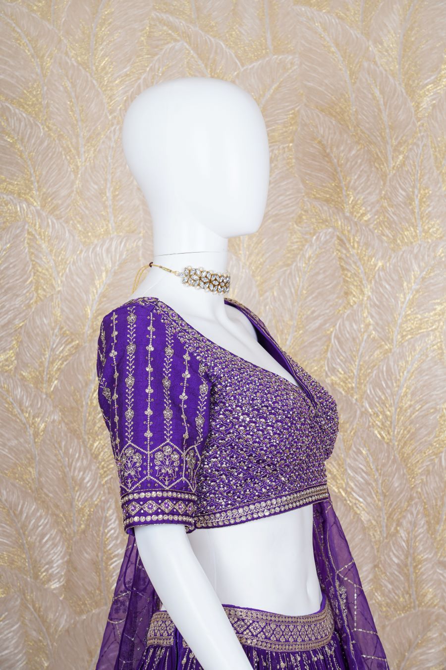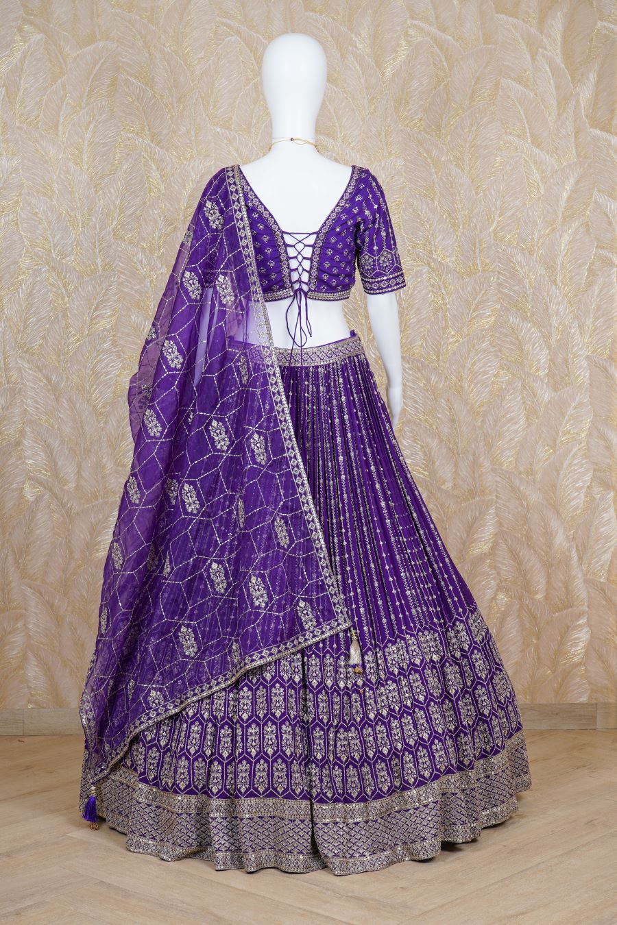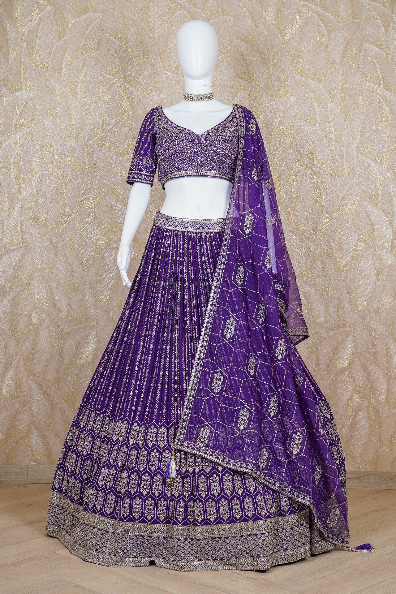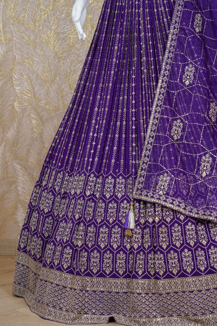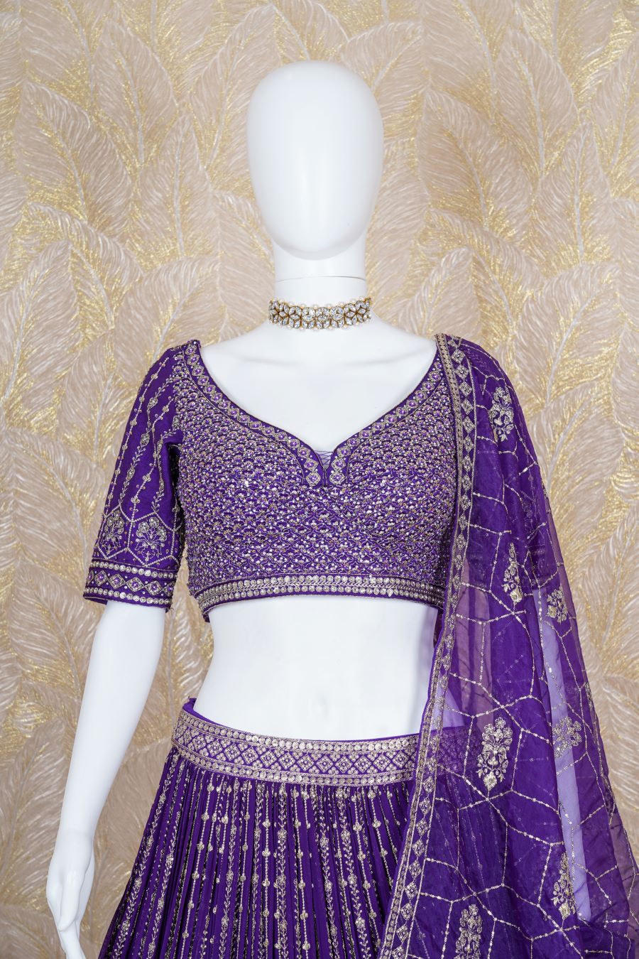 Purple Georgette Lehenga with additional embellishments of golden zari, kardana, sequins and pearls work with a handcrafted blouse and geometric jaal and bordered embroidered dupatta. Model is wearing size, “Medium”.