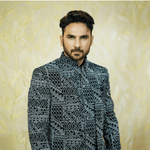 This stunning black kurta pajama and jacket set features exquisite white detailing that beautifully enhances its elegant design.