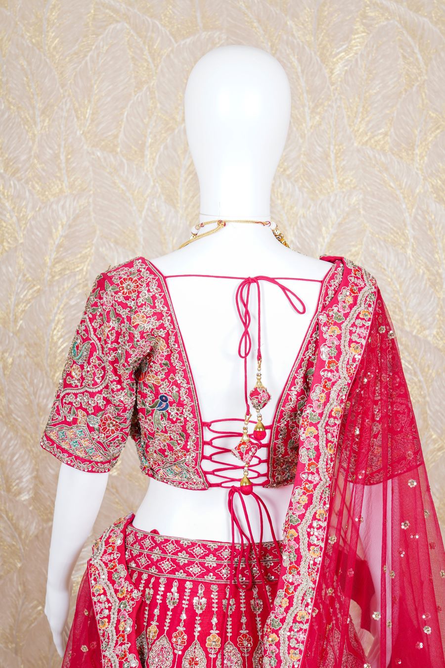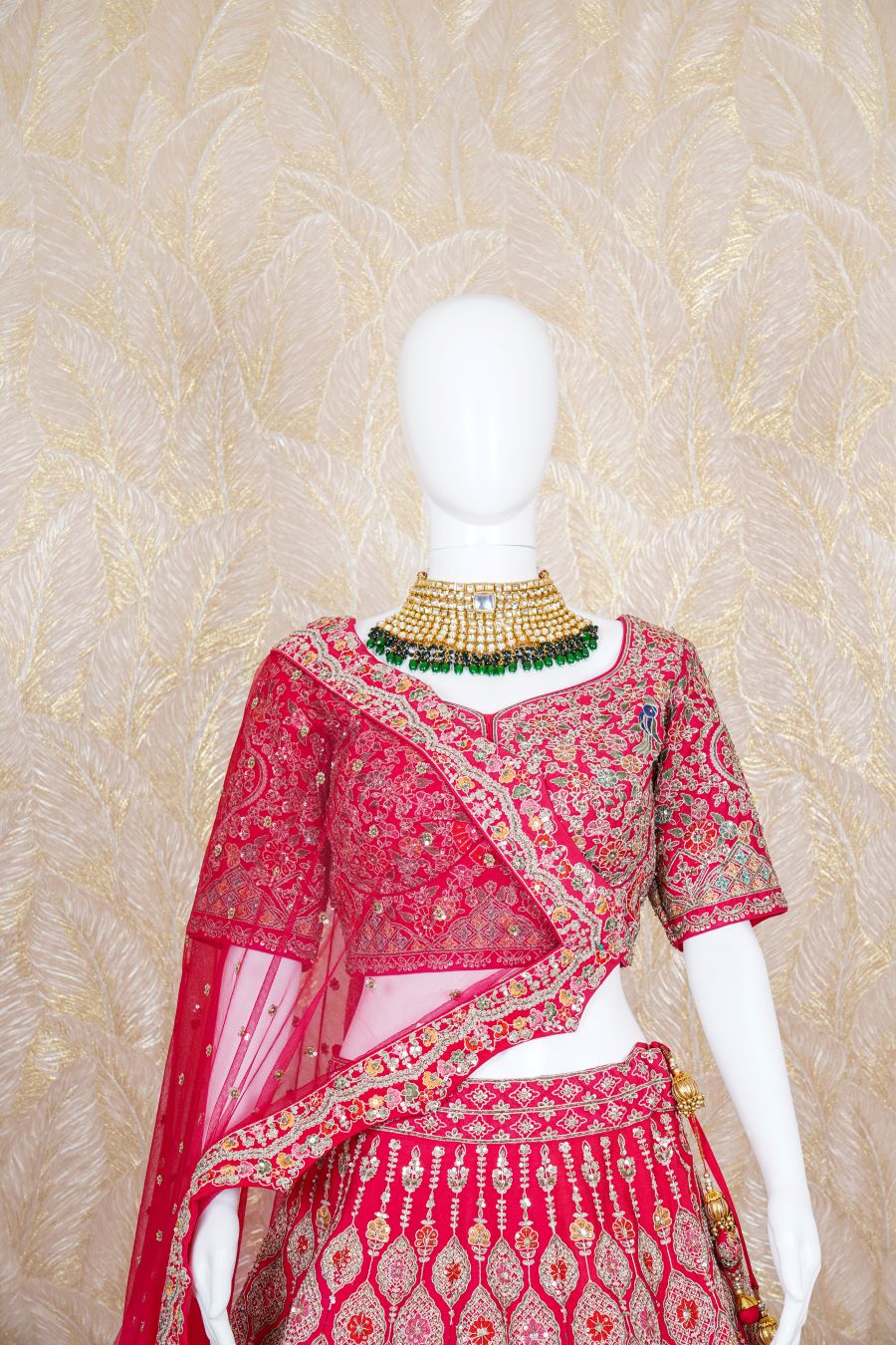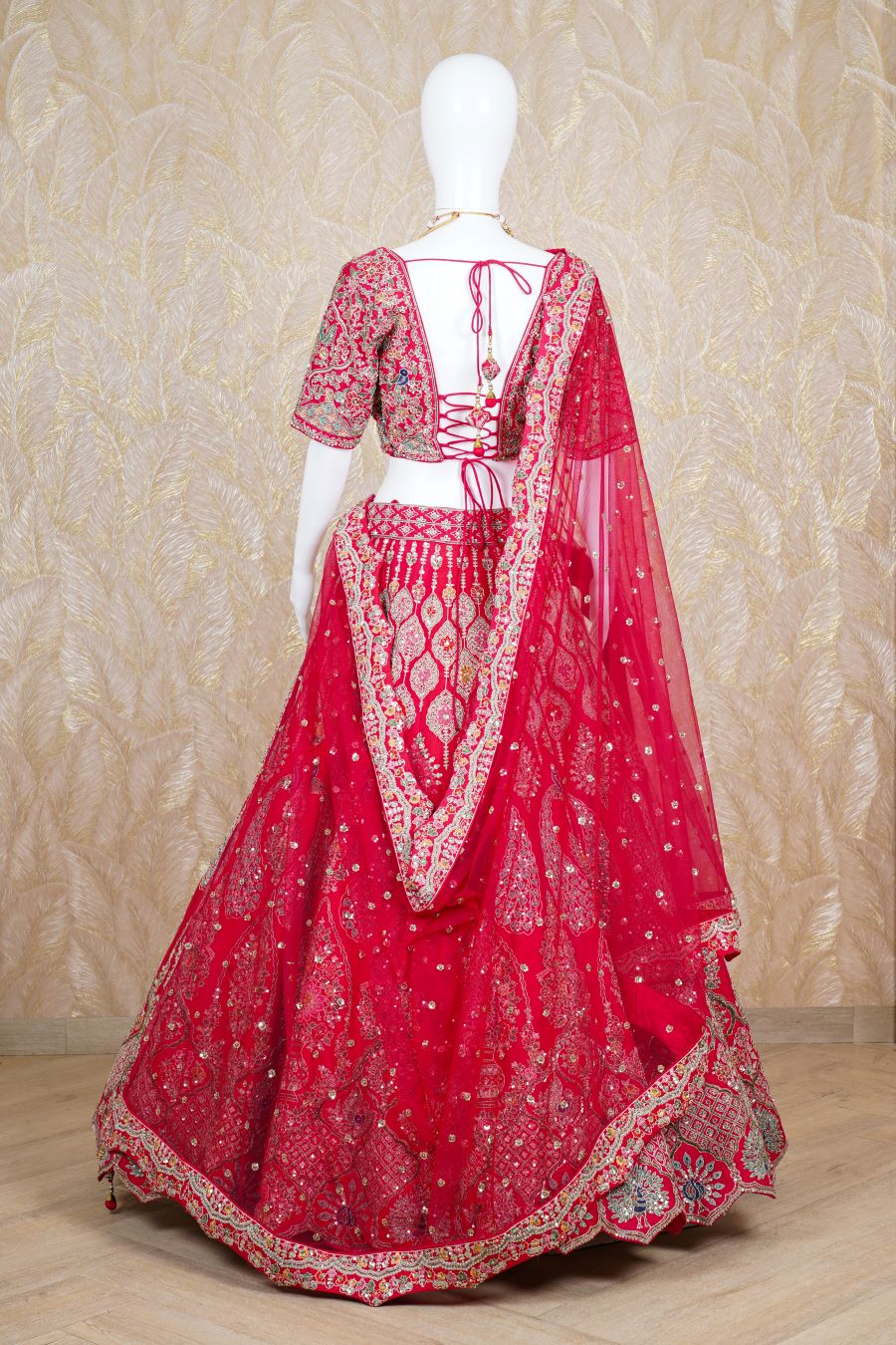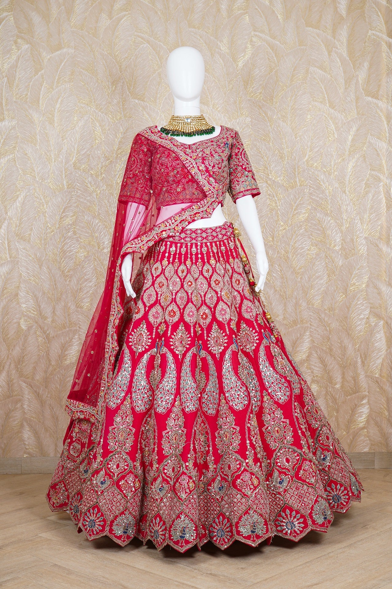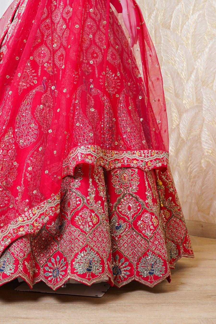 Red Rawsilk Lehenga peacock element with additional embellishments of golden fine dori, resham, zardosi and sequins work with a handcrafted blouse and heavy scallops bordered dupatta. Model is wearing size, “Medium”.