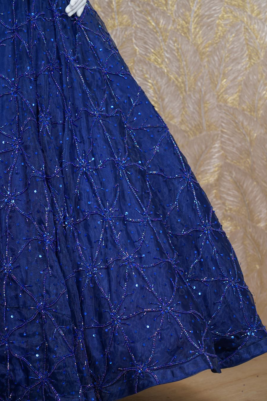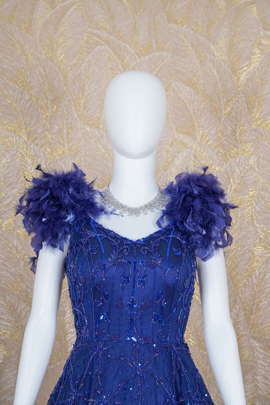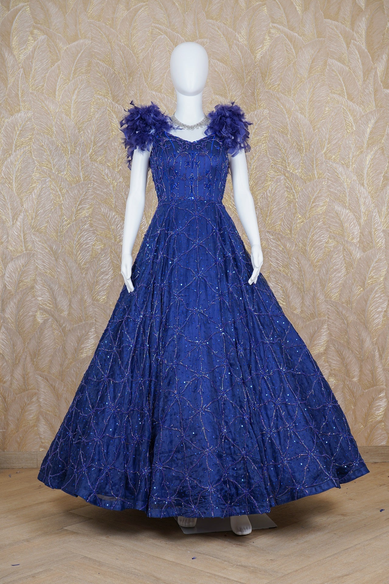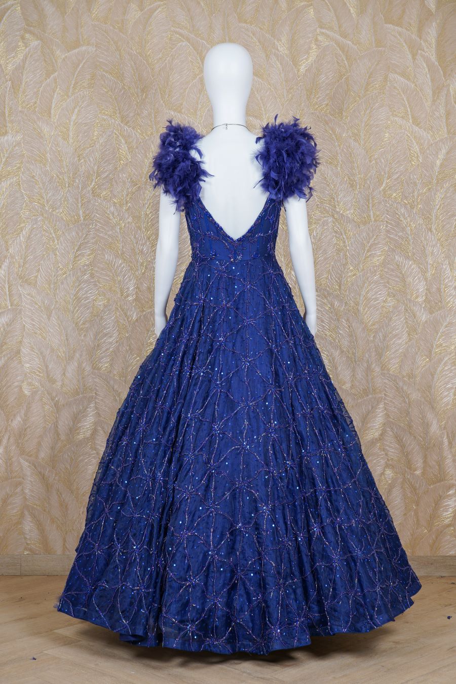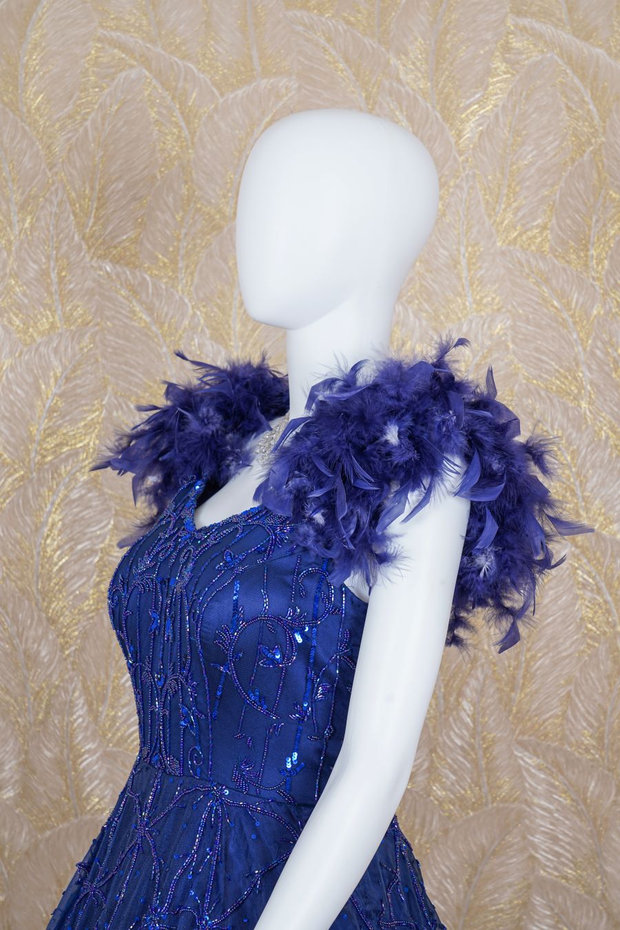 Royal Blue Organza gown embellished with kardana, beads and sequins work. Shoulder is finished with feathers. Model is wearing size, “Medium”.