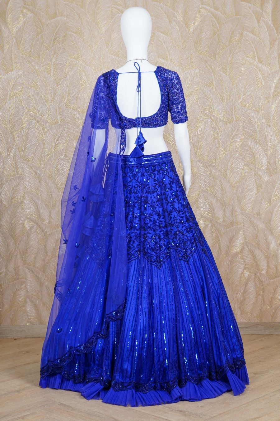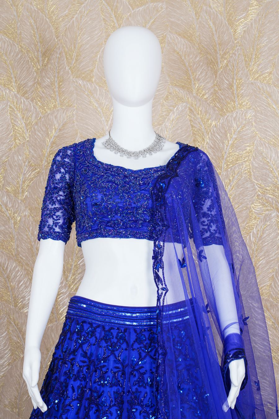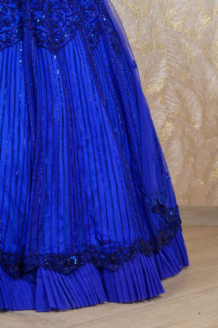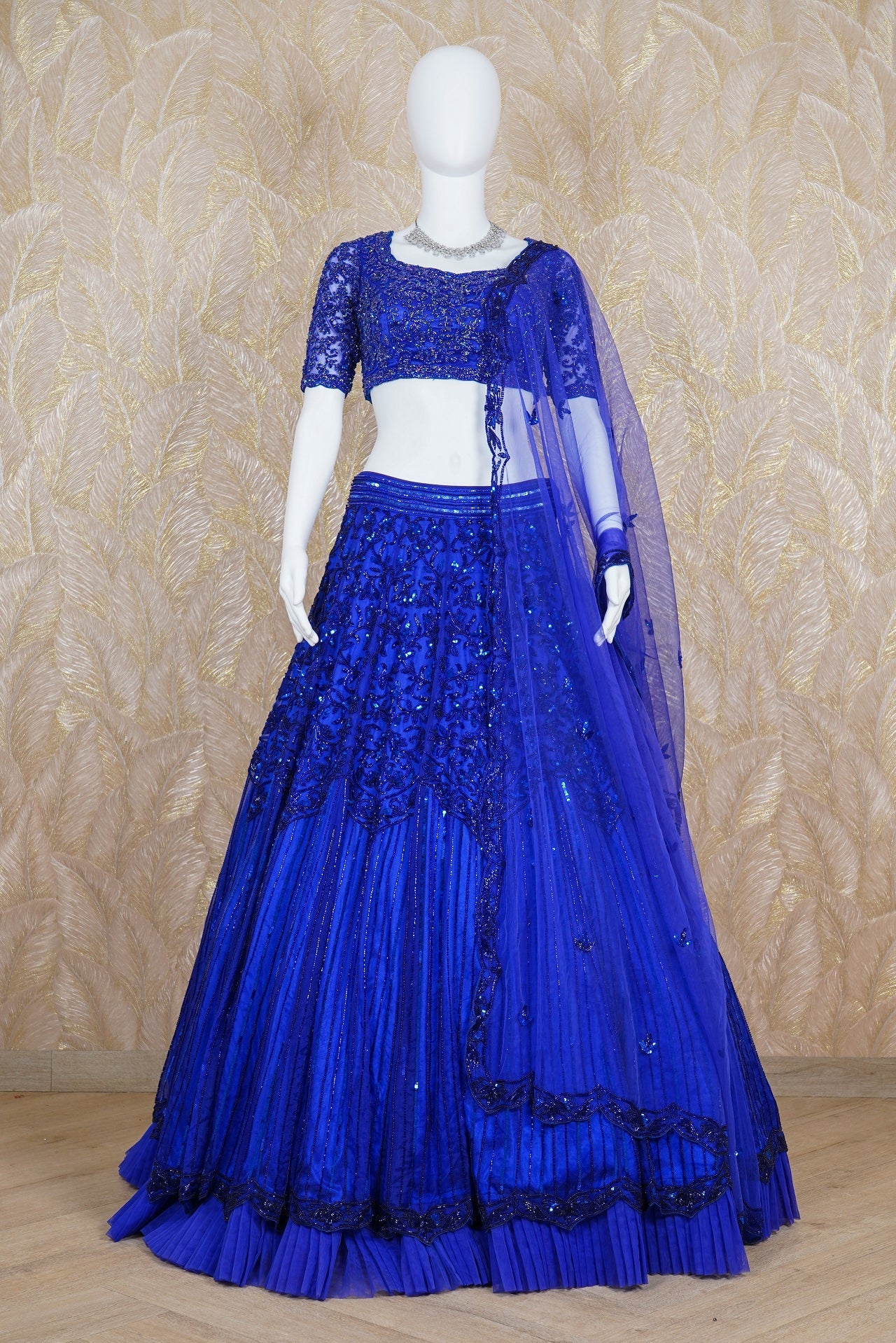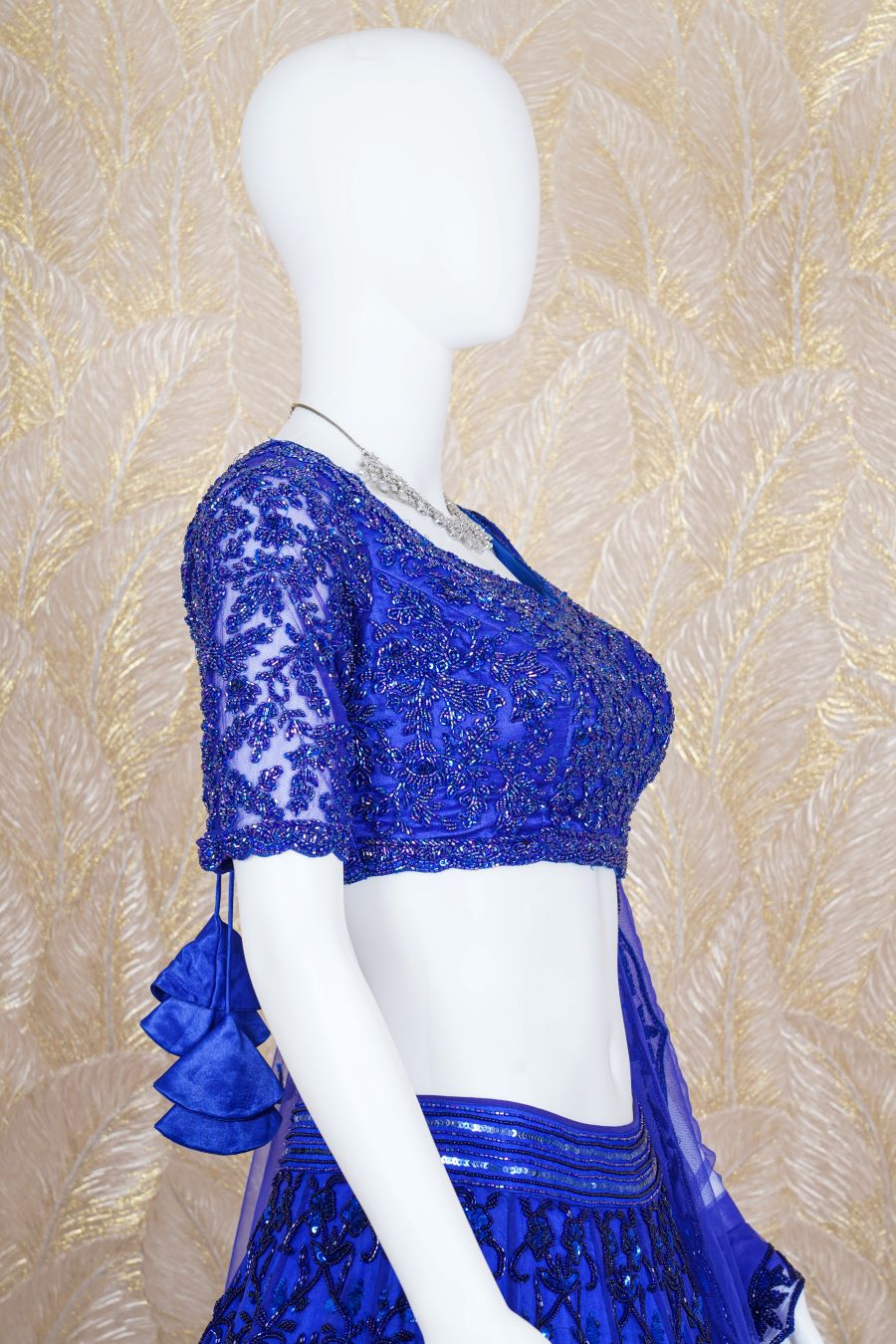Royal Blue Organza Lehenga with additional embellishments of pearls, sequins, and kardana handwork paired with a matching embroidered blouse and styled with a cut-worked tulle dupatta. Model is wearing size, “Medium”.