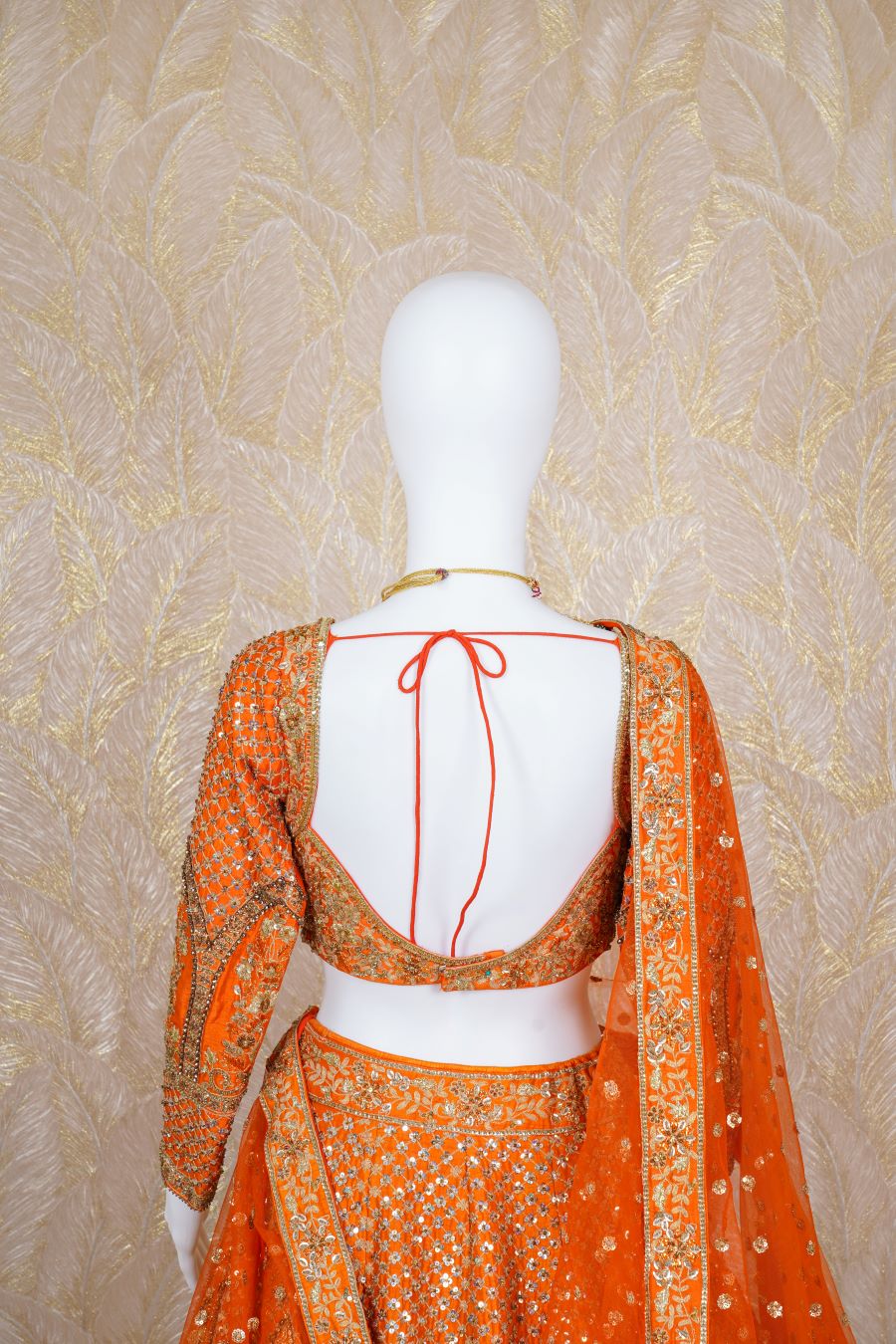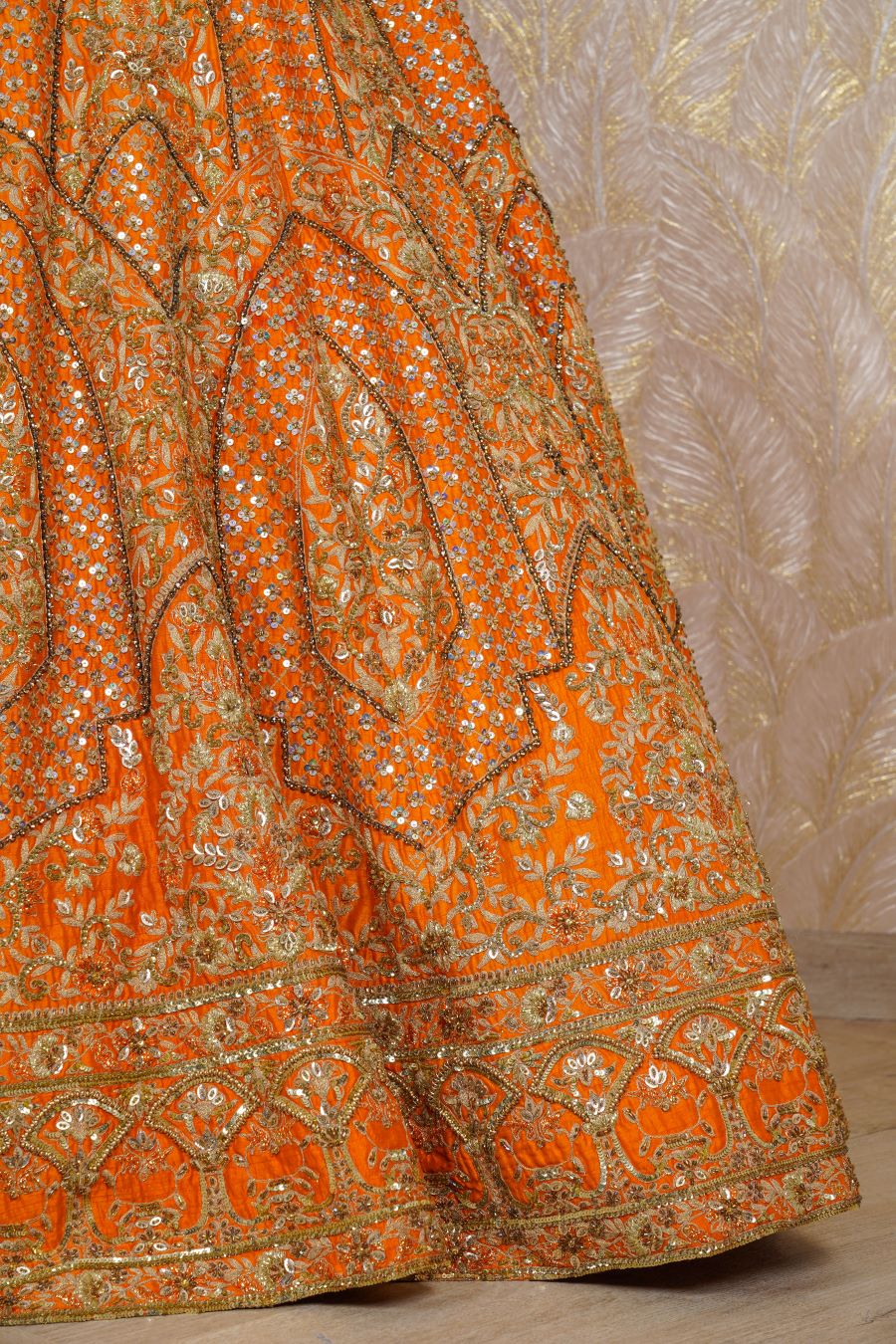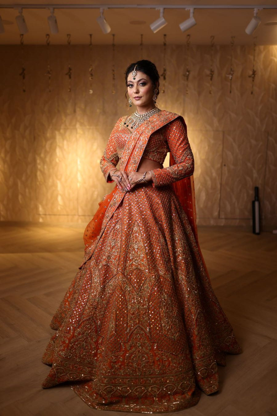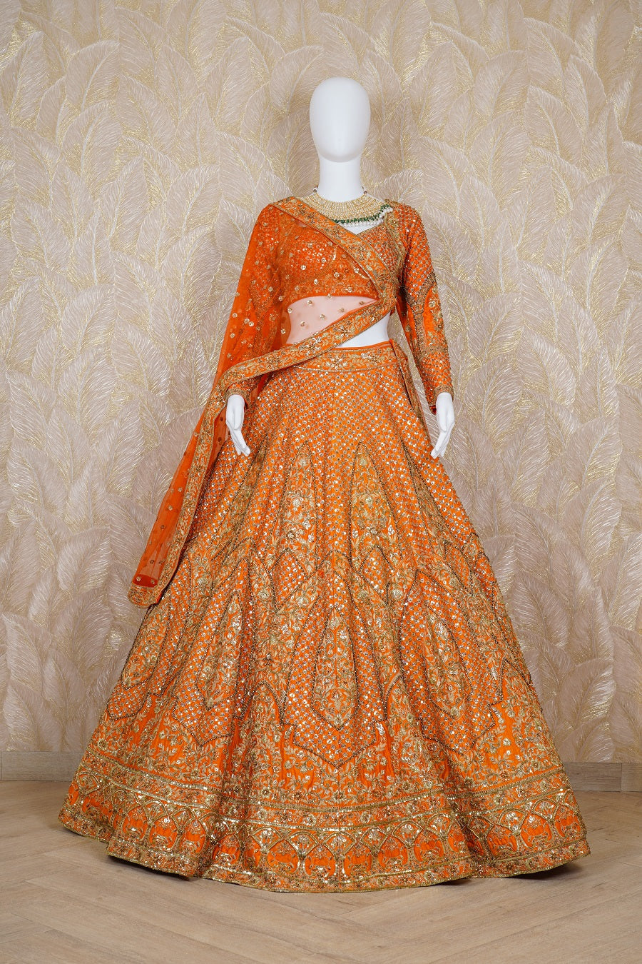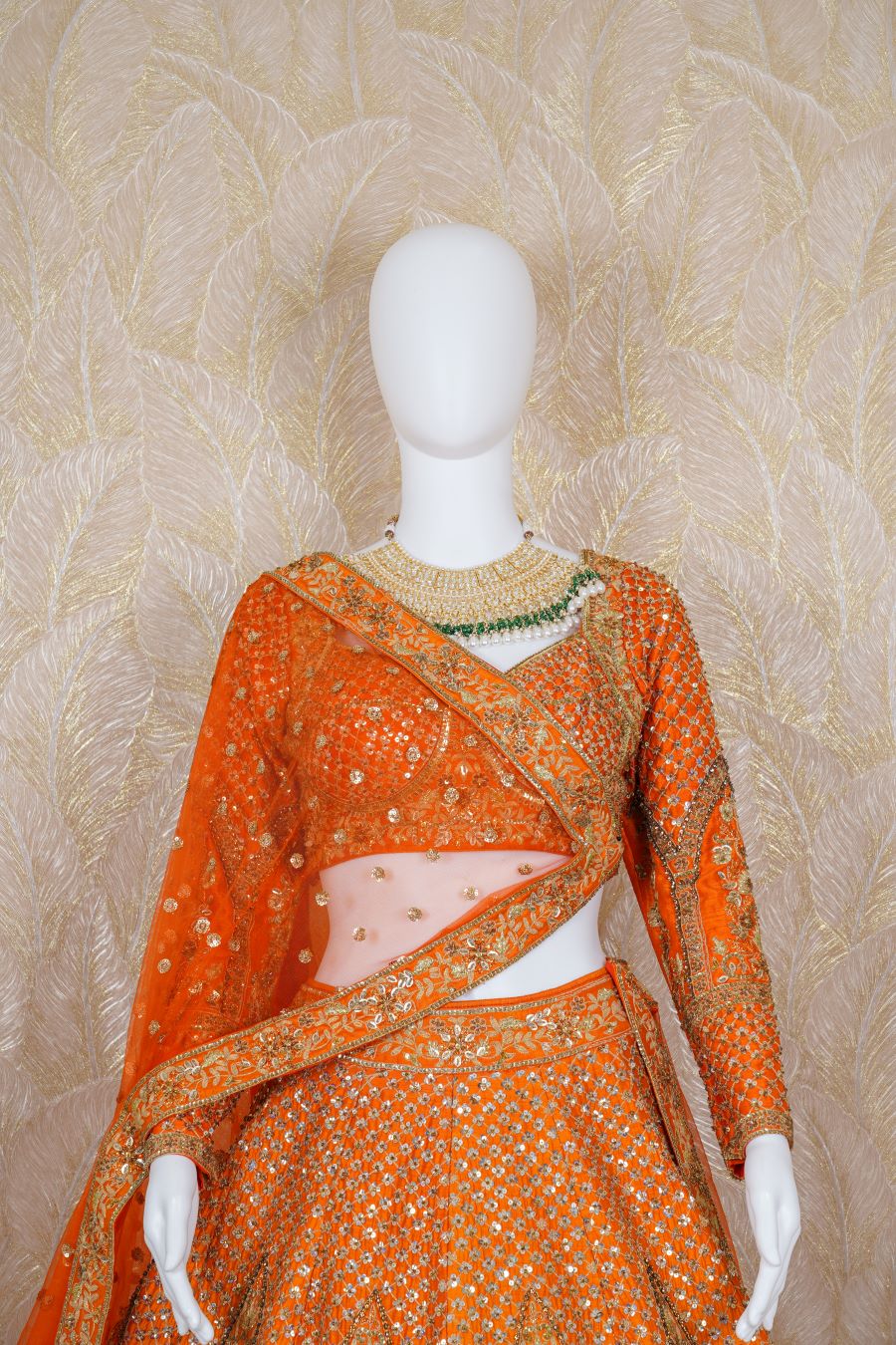 Rust Orange Rawsilk Lehenga with dori, aari work and sequins handwork with an embroidered blouse and heavy bordered tulle dupatta. Model is wearing size, “Medium”.