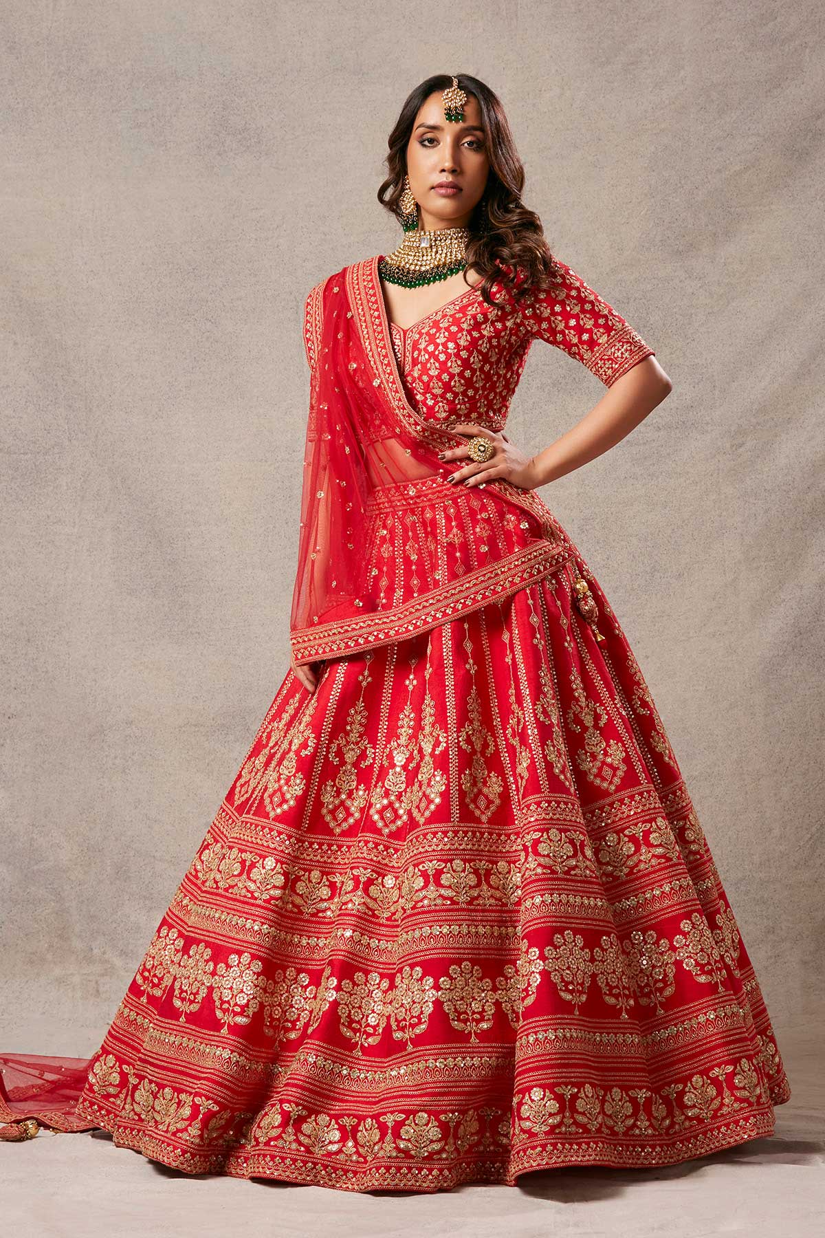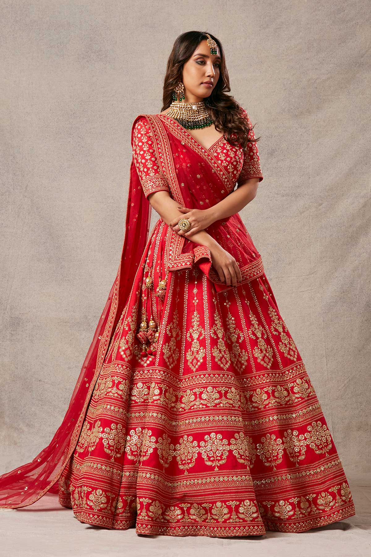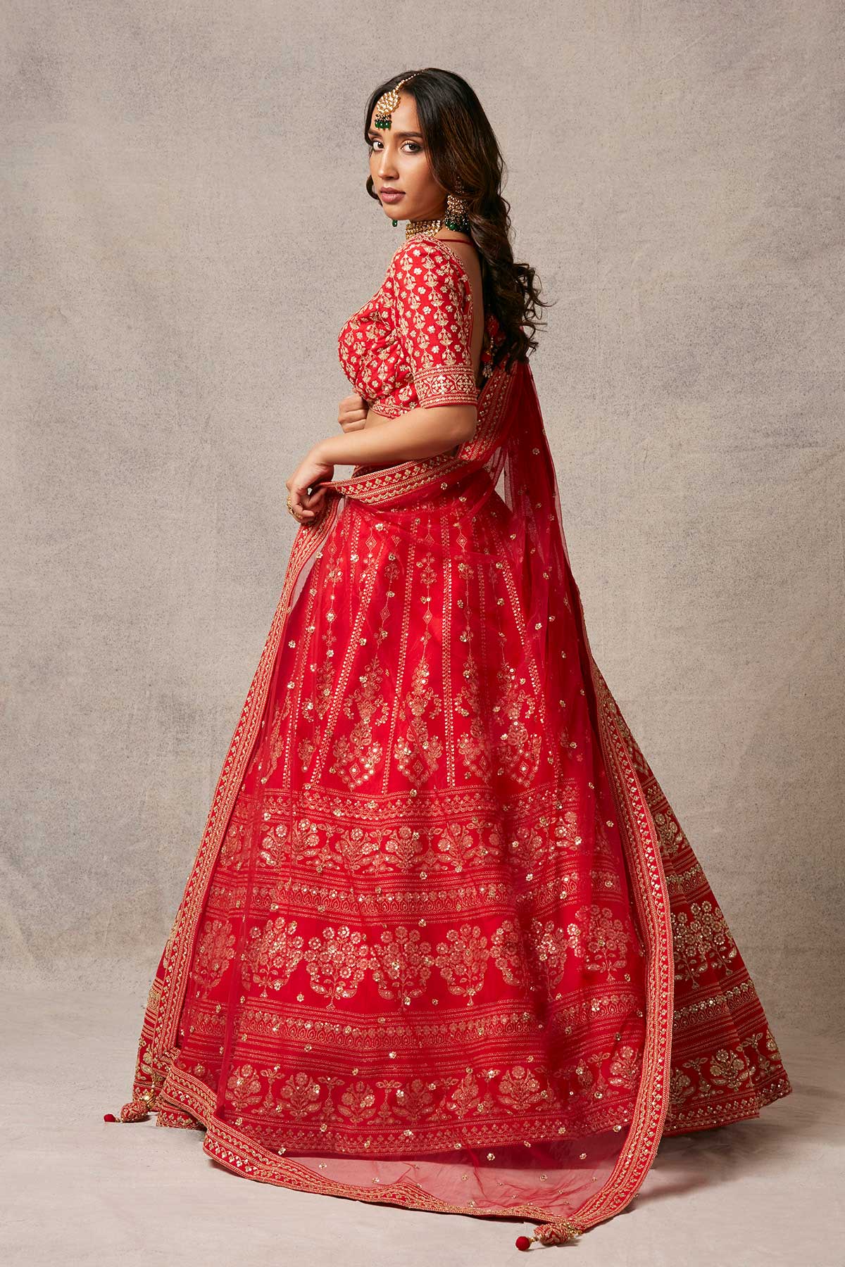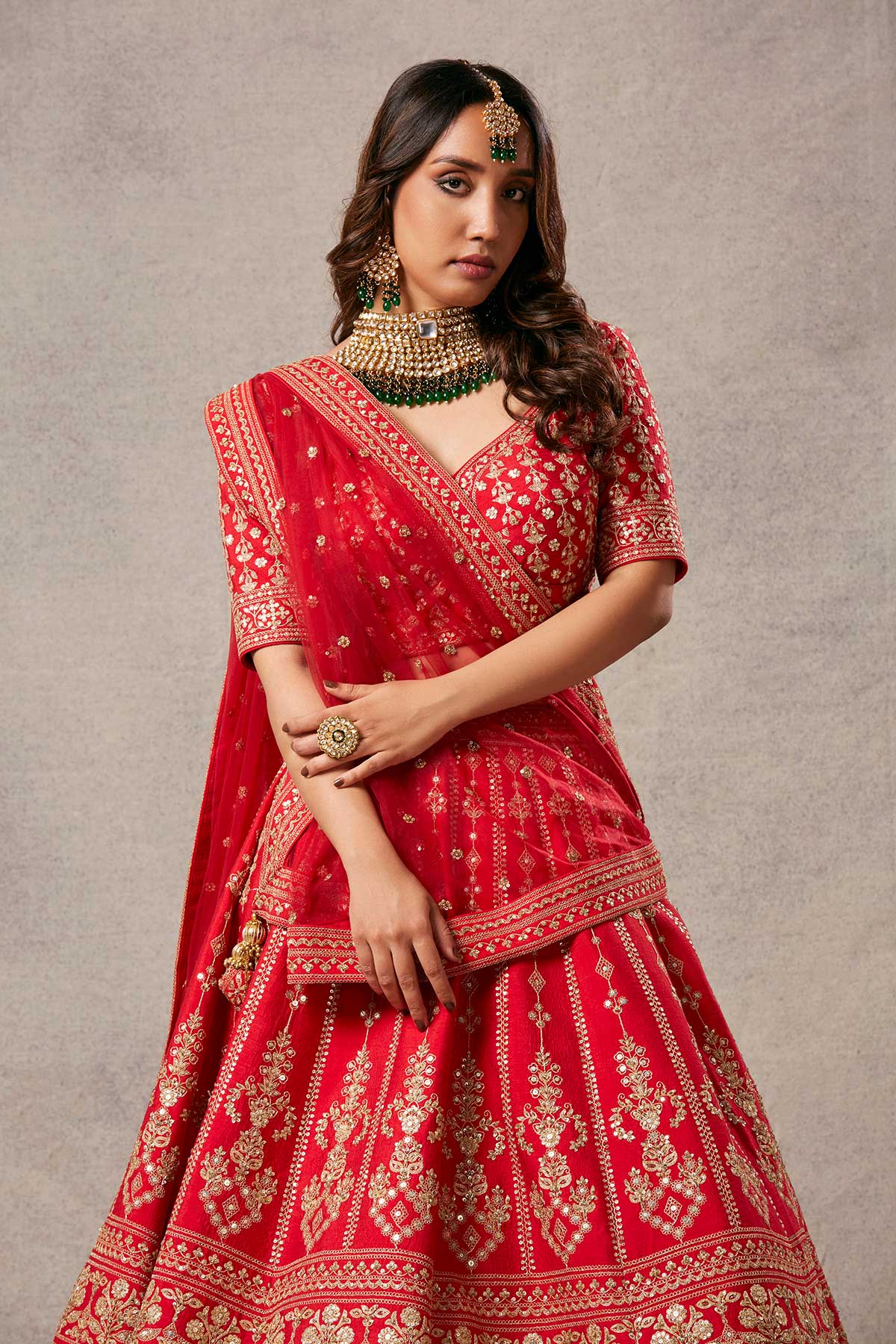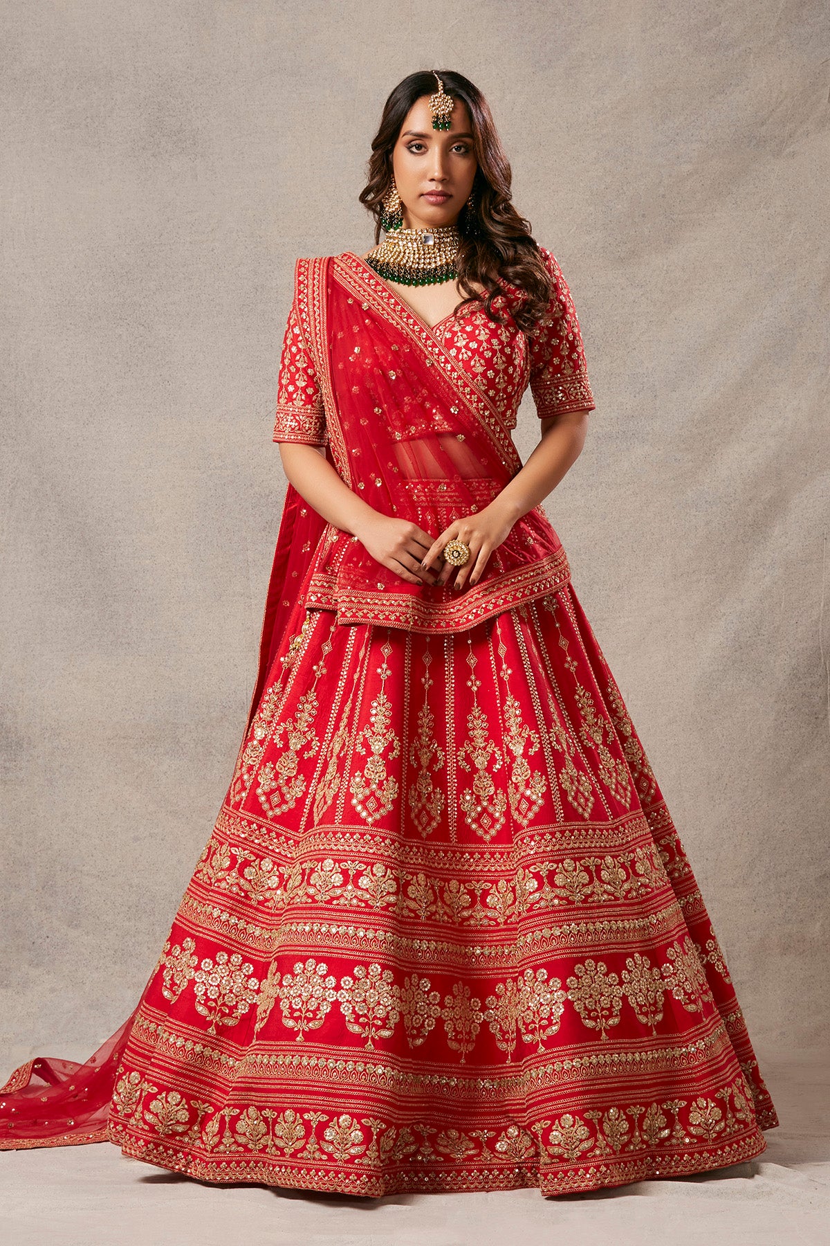 Beautiful red lehenga with blouse with incarnate dori work and elegant net dupatta.