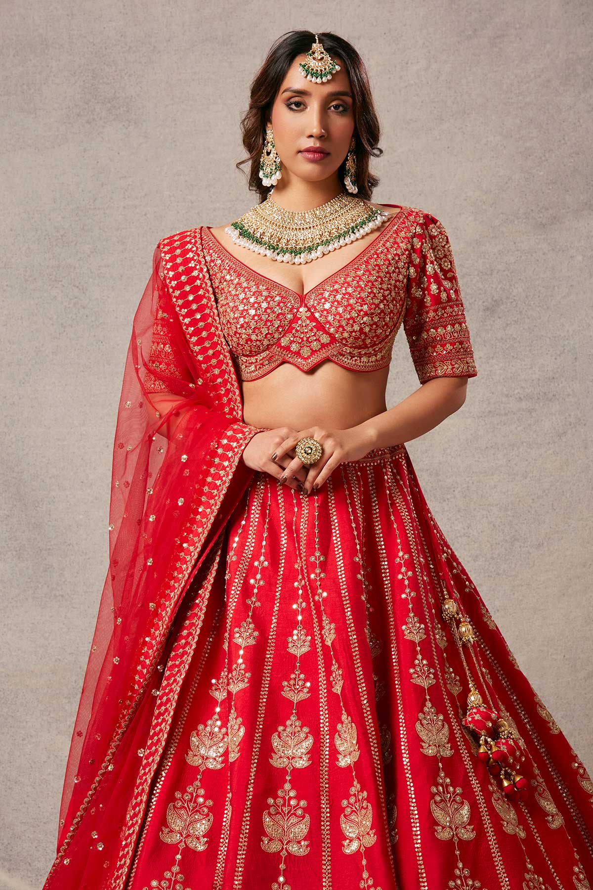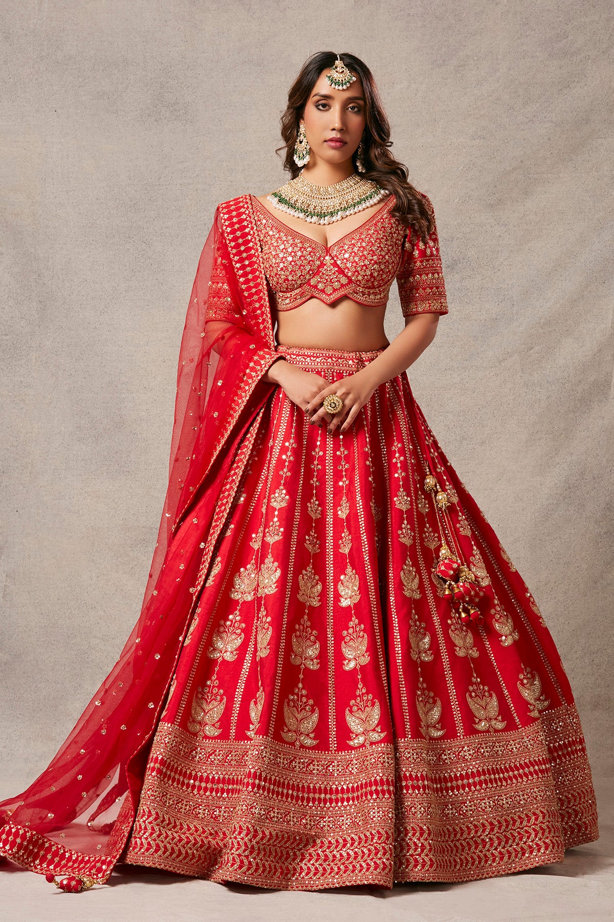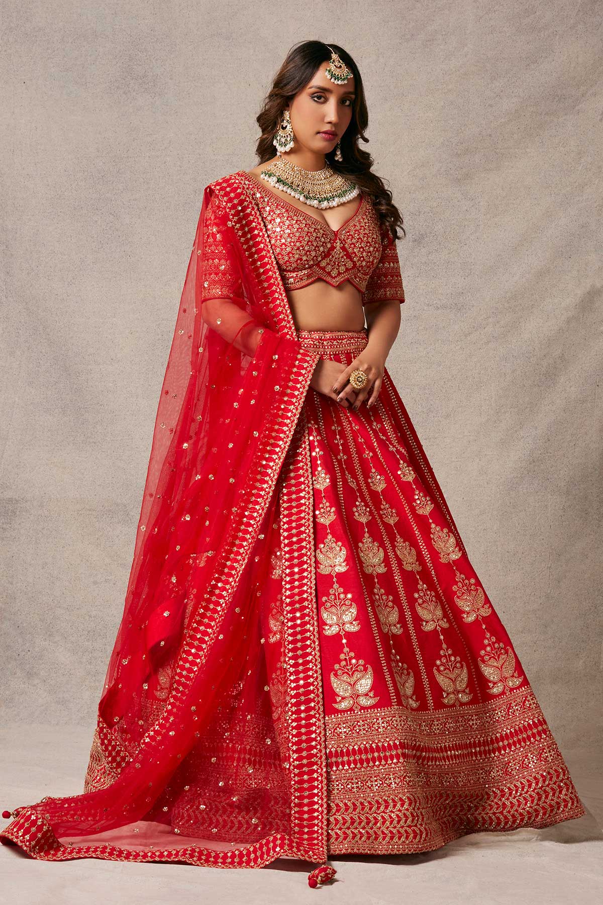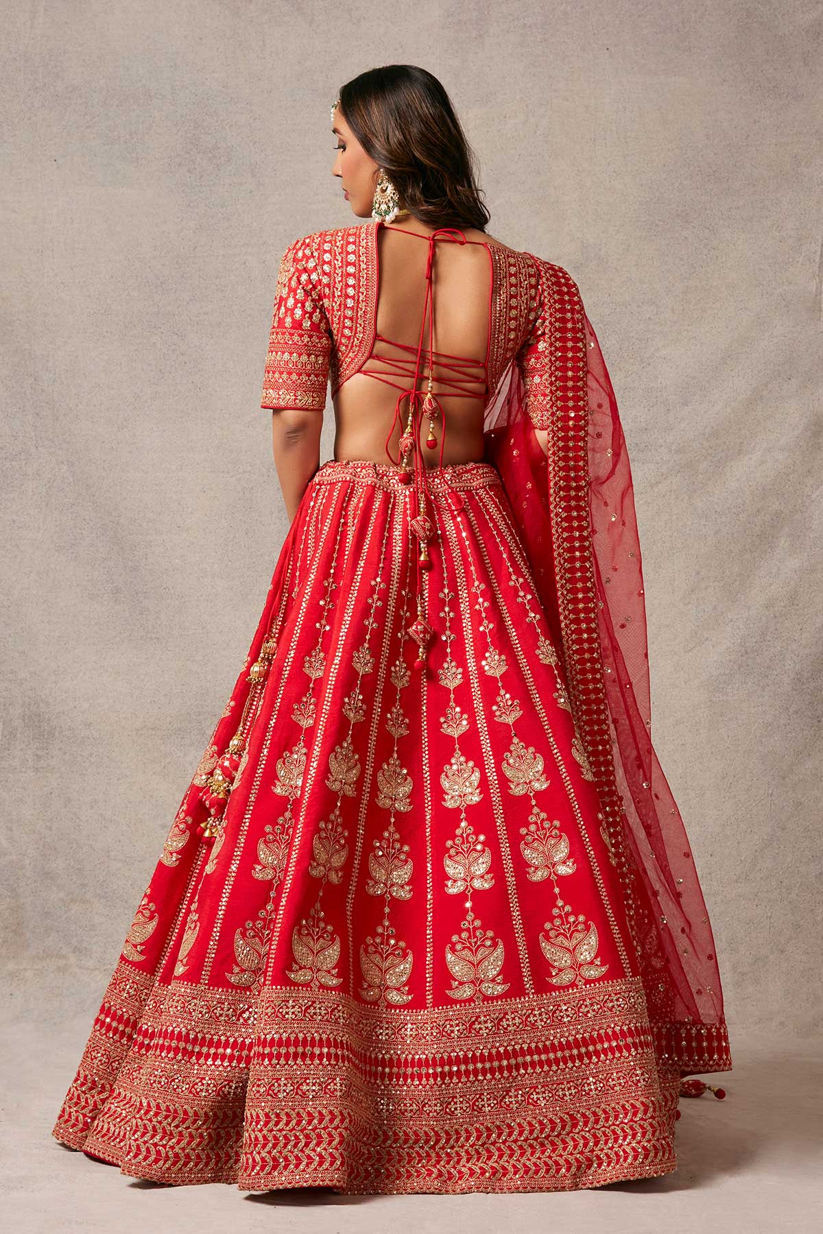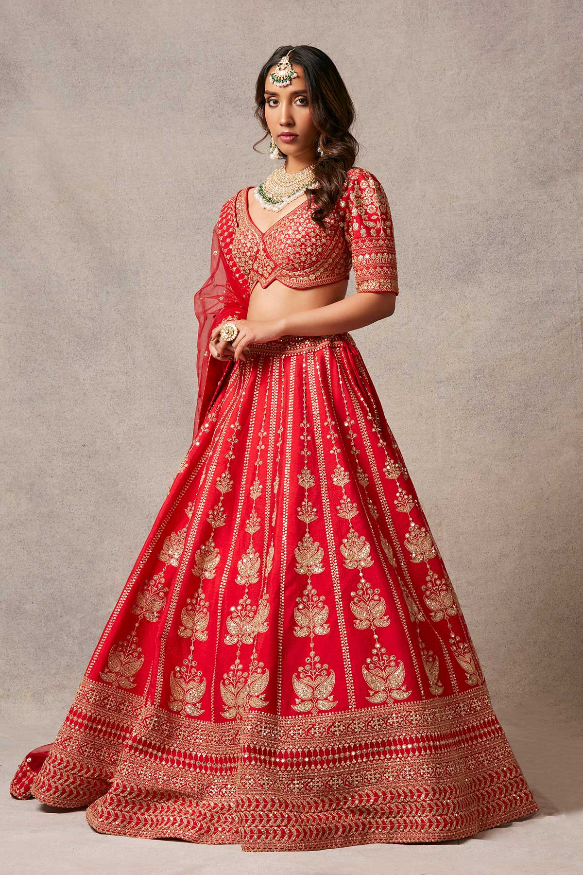 Imprints of beautiful lotuses on a red lehenga with elegant dori work on blouse and breathtaking red net dupatta.