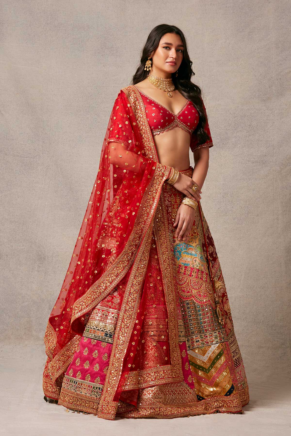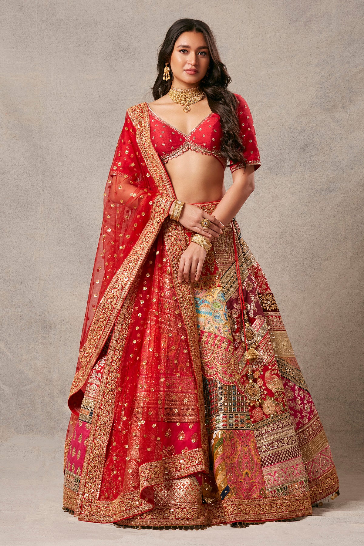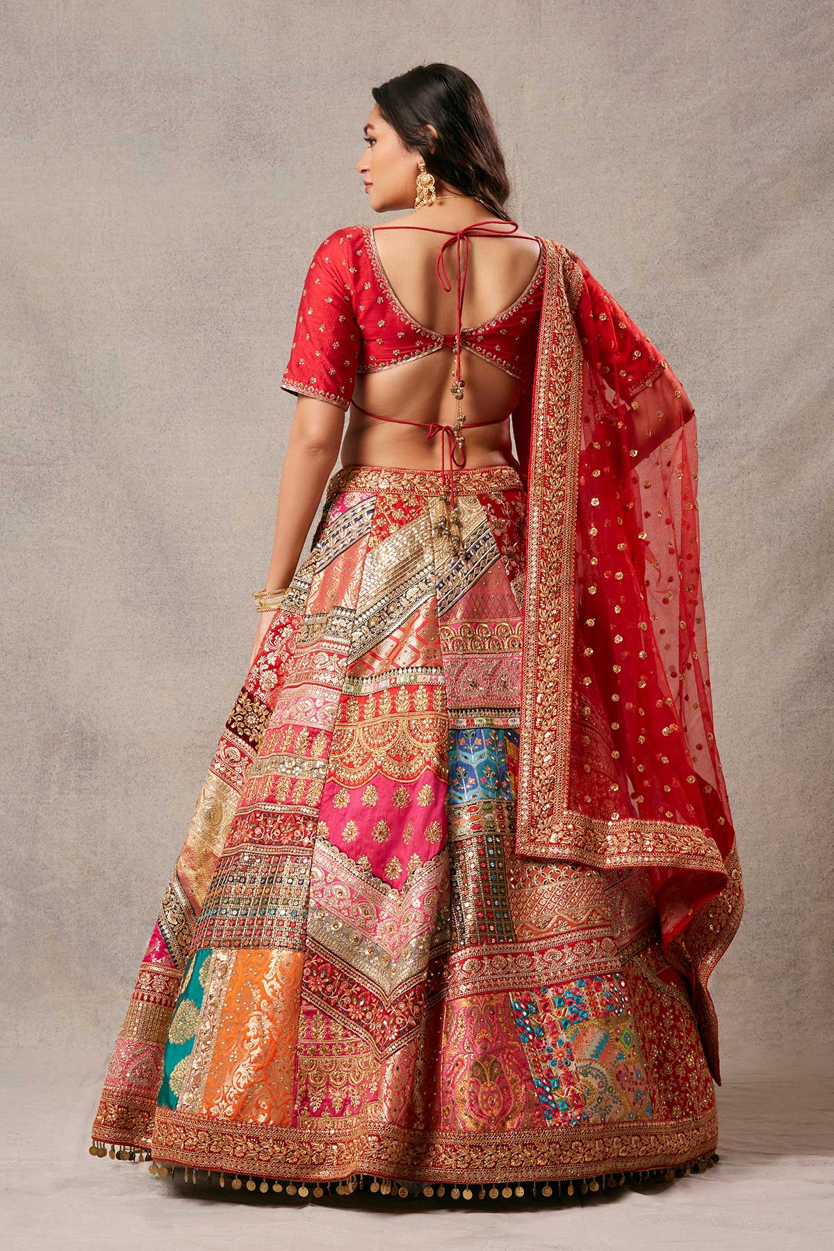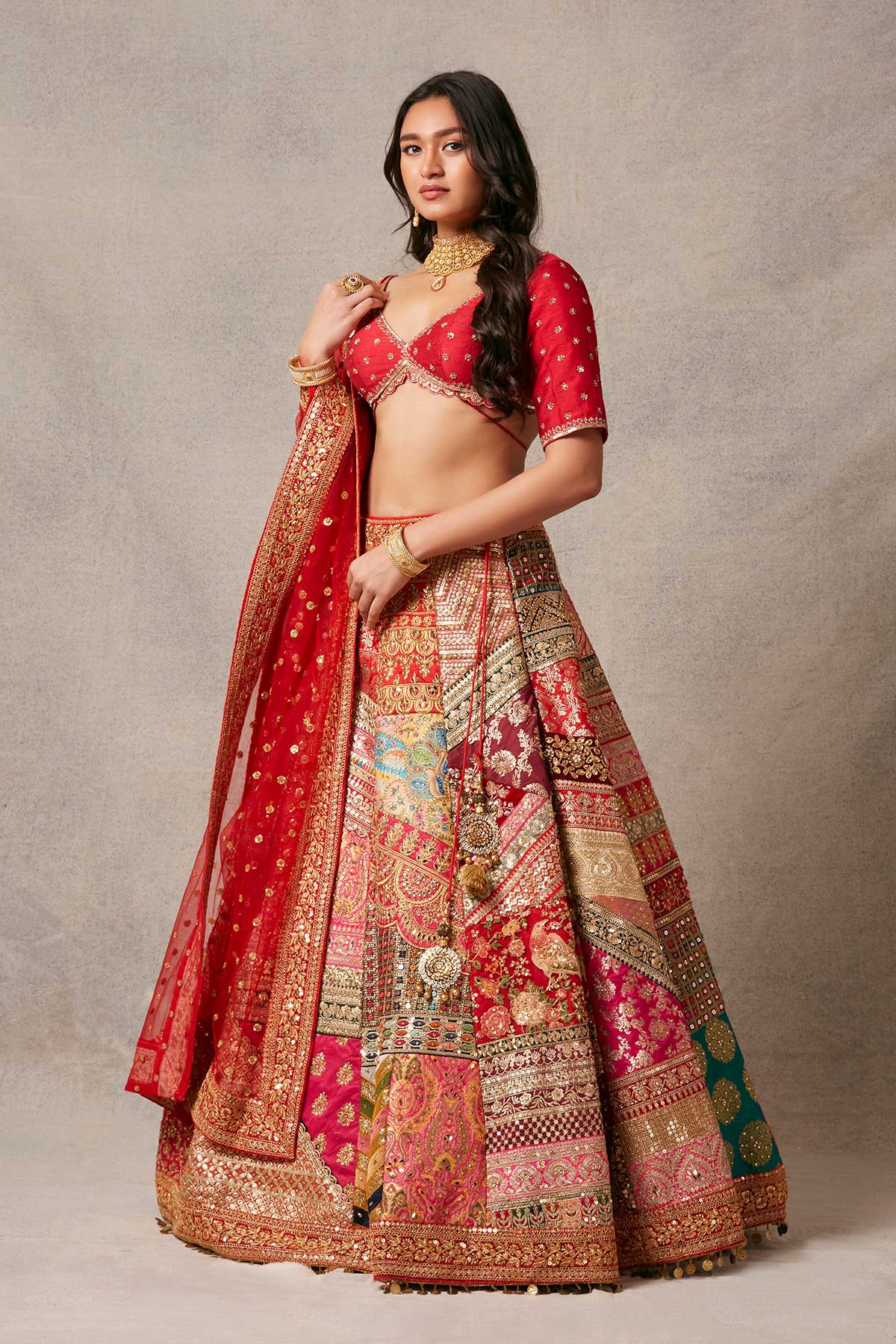 Multipatch lehenga with an elegant blouse made of raw silk and gracefully paired with an embroidered net dupatta.