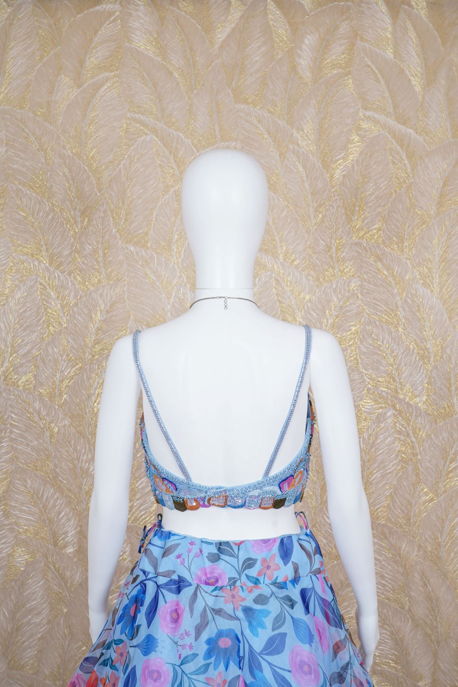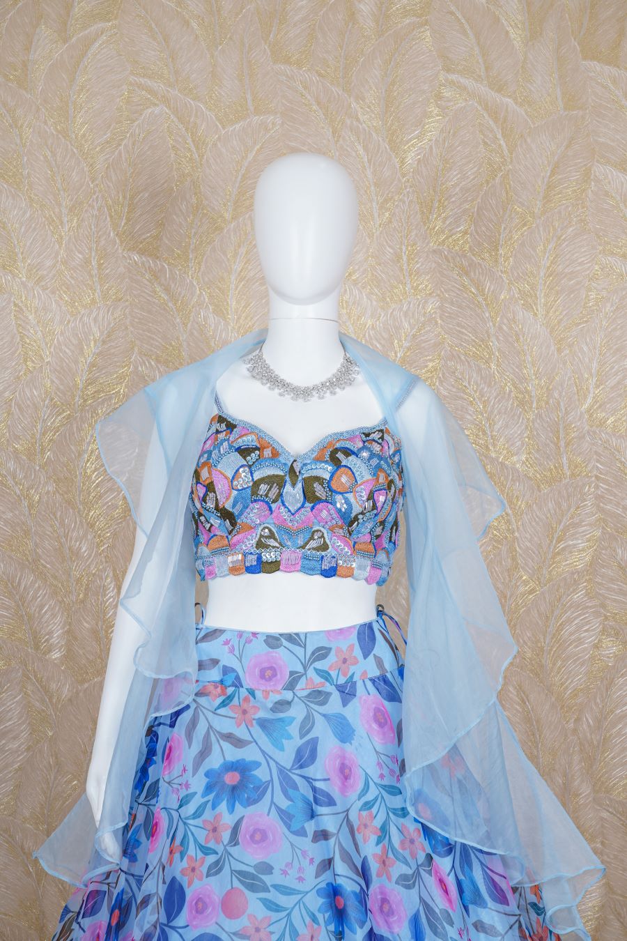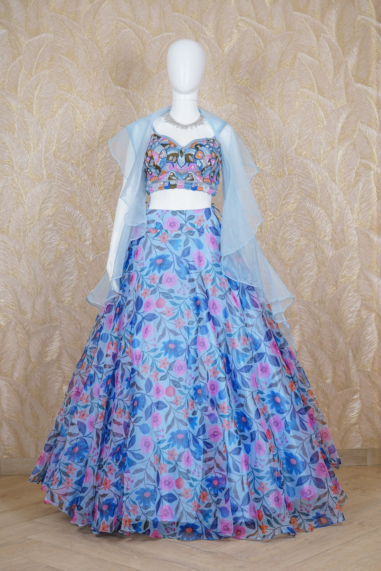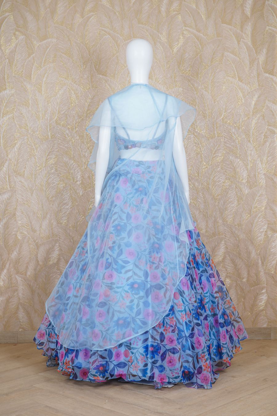 Sky Blue Organza digital printed Lehenga styled with resham, pearls, kaRdana and sequins handcrafted blouse with a cape. Model is wearing size, “Medium”.