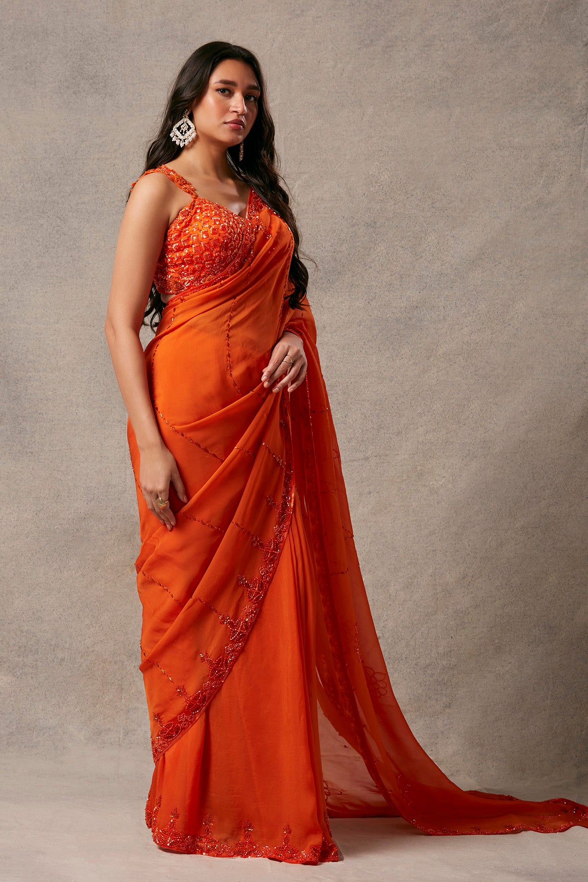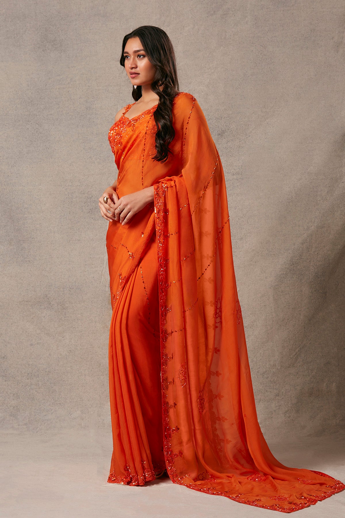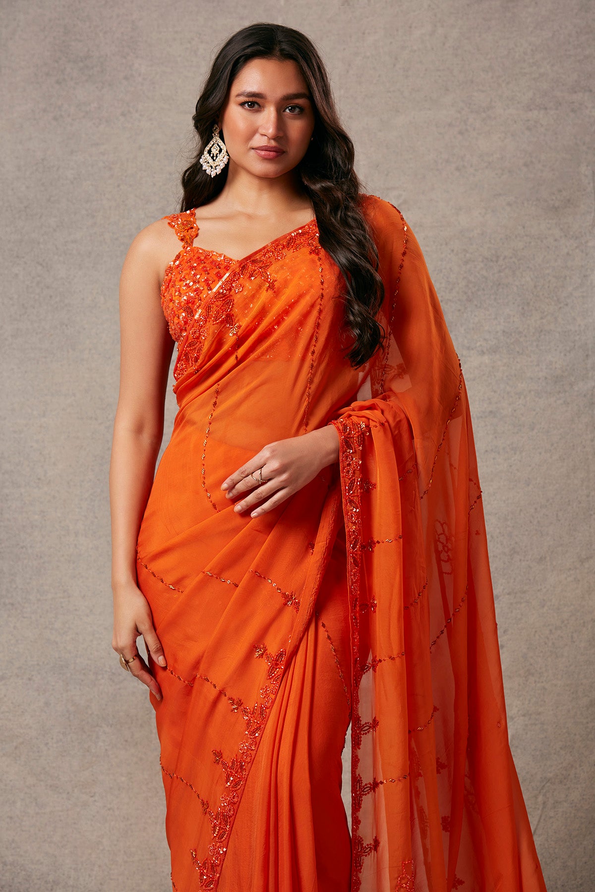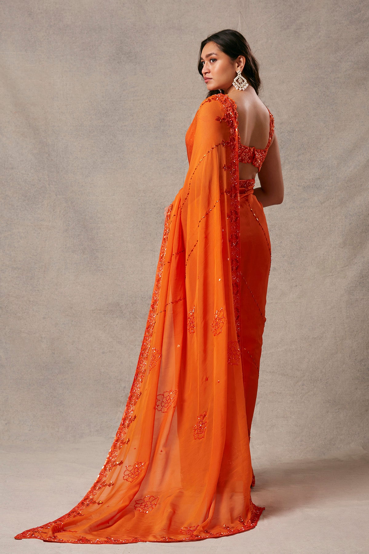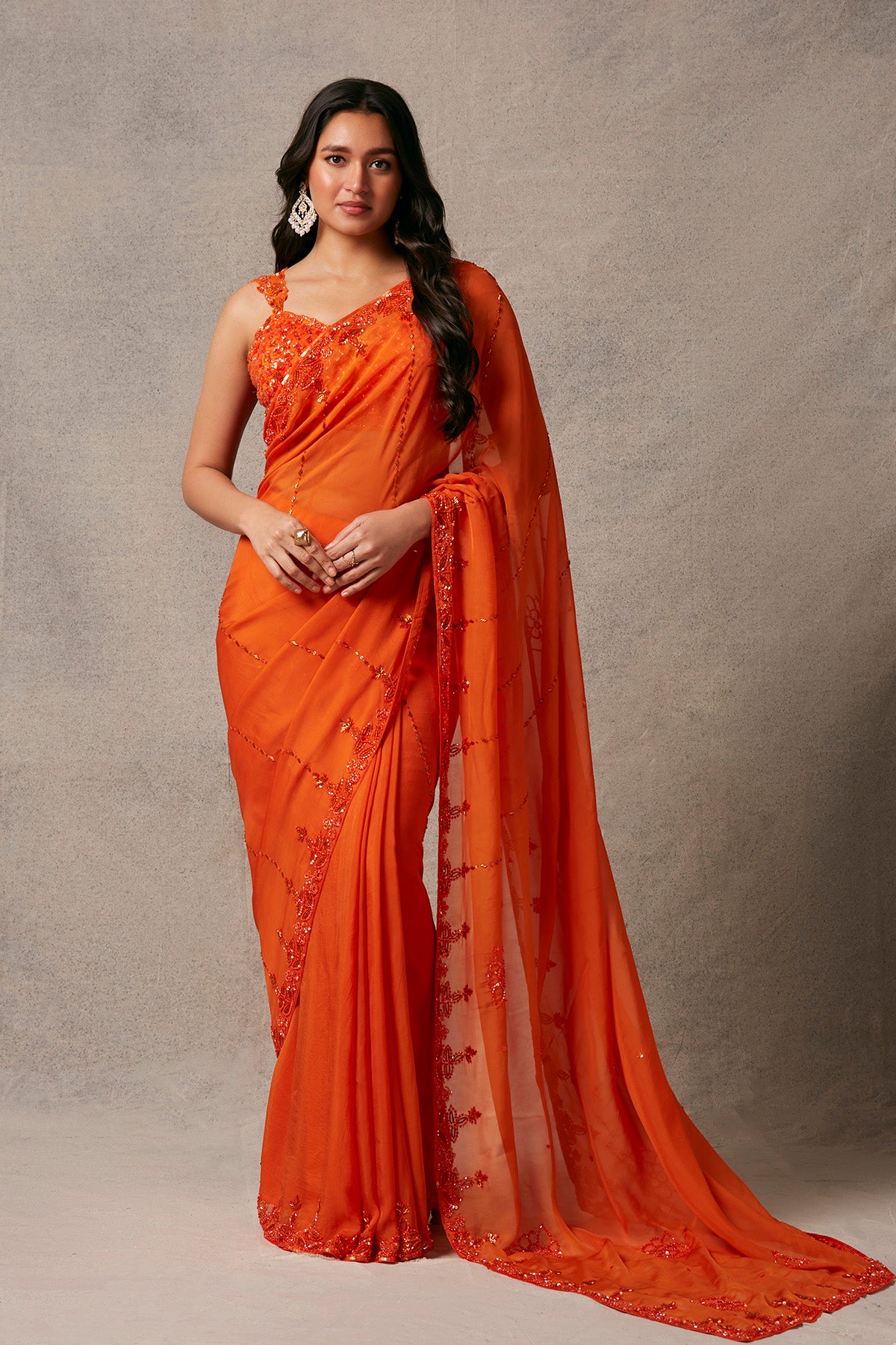 A stunning orange chiffon saree adorned with exquisite hand embroidery on the saree and blouse.