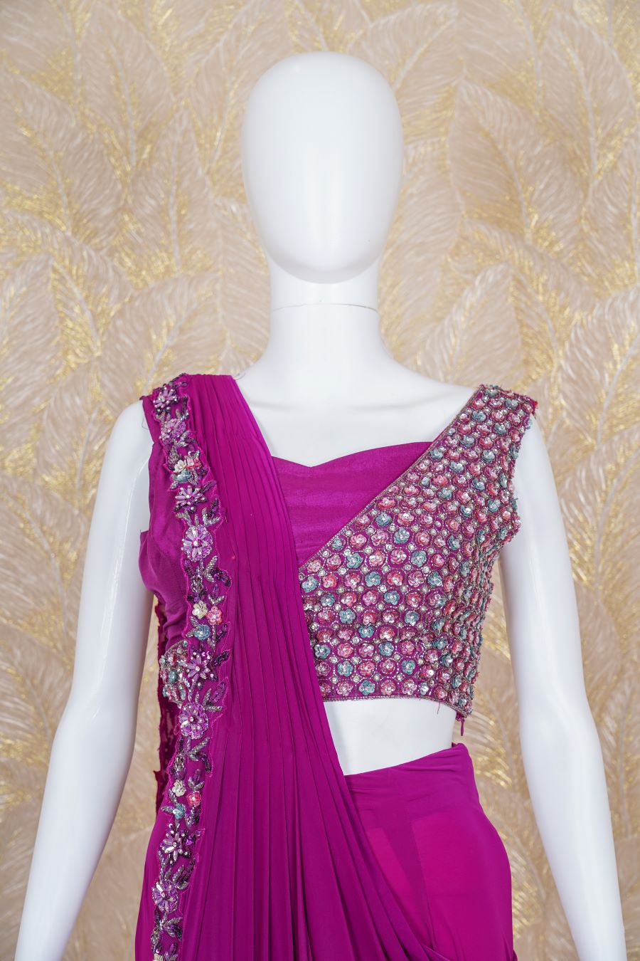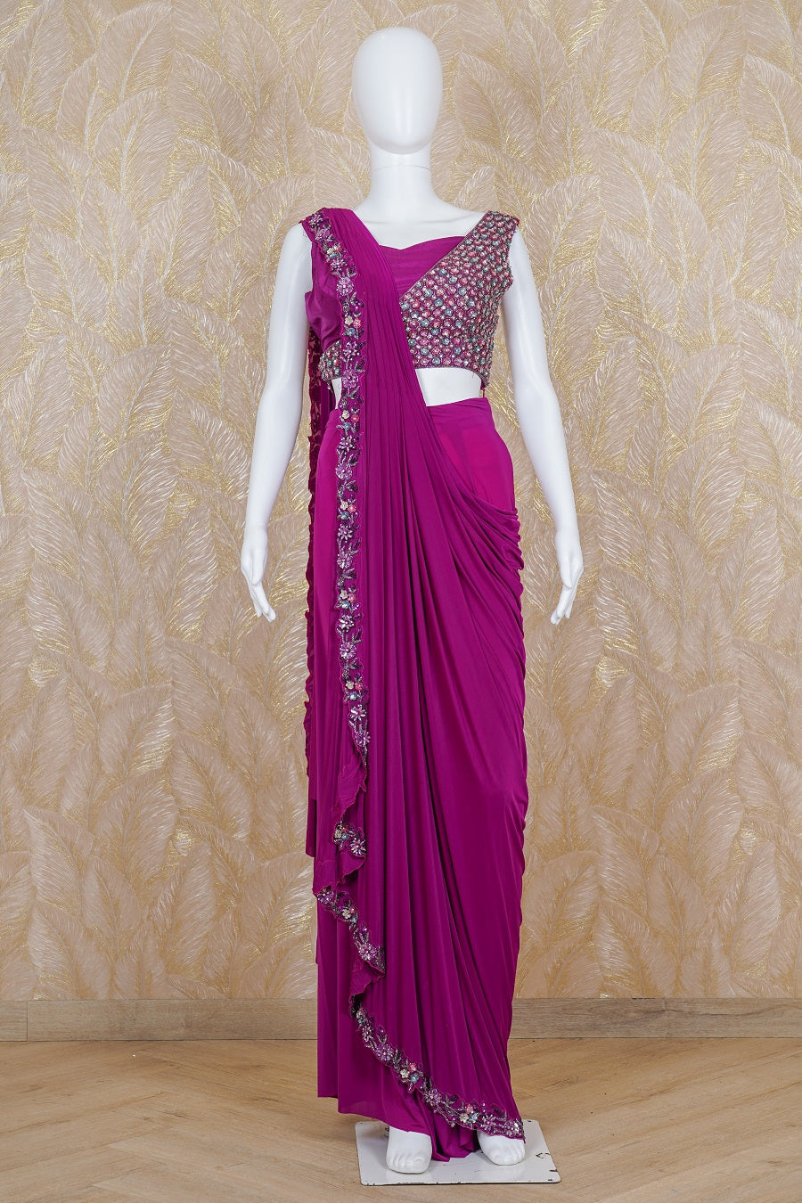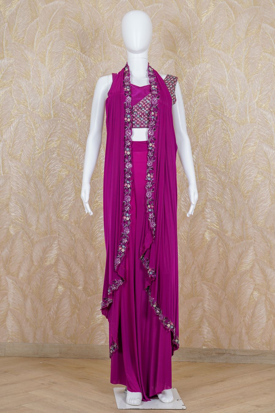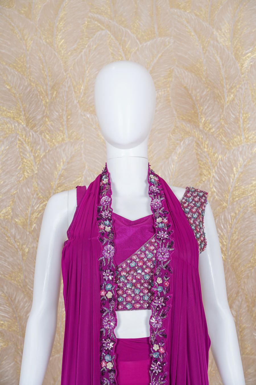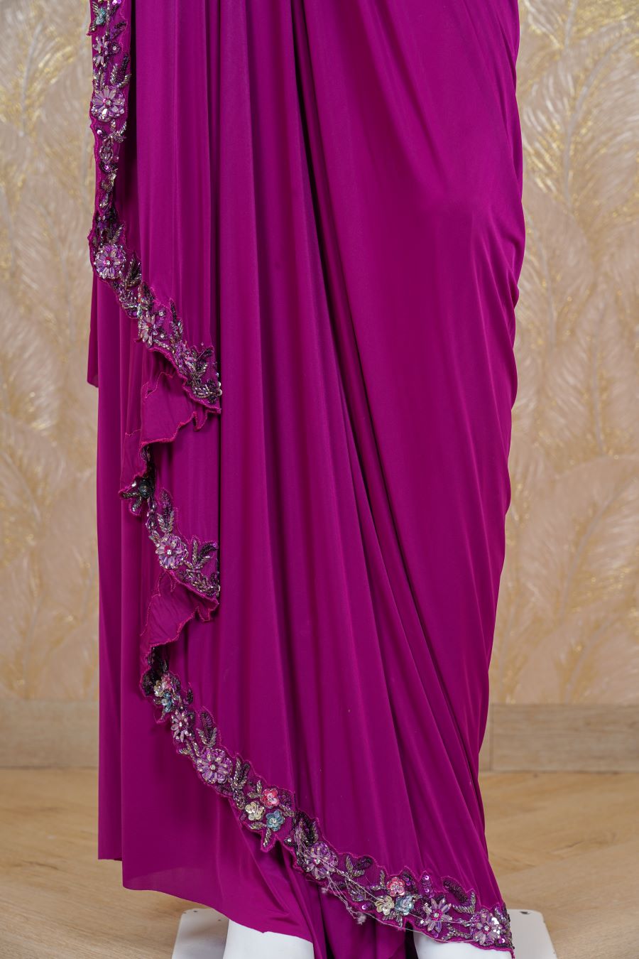 Wine Color Lycra Drape Set embellished with sequins embroidered crop top. Paired with a cowl drape, one-shoulder embroidered bordered and flared pants. Model is wearing size, “Medium”.