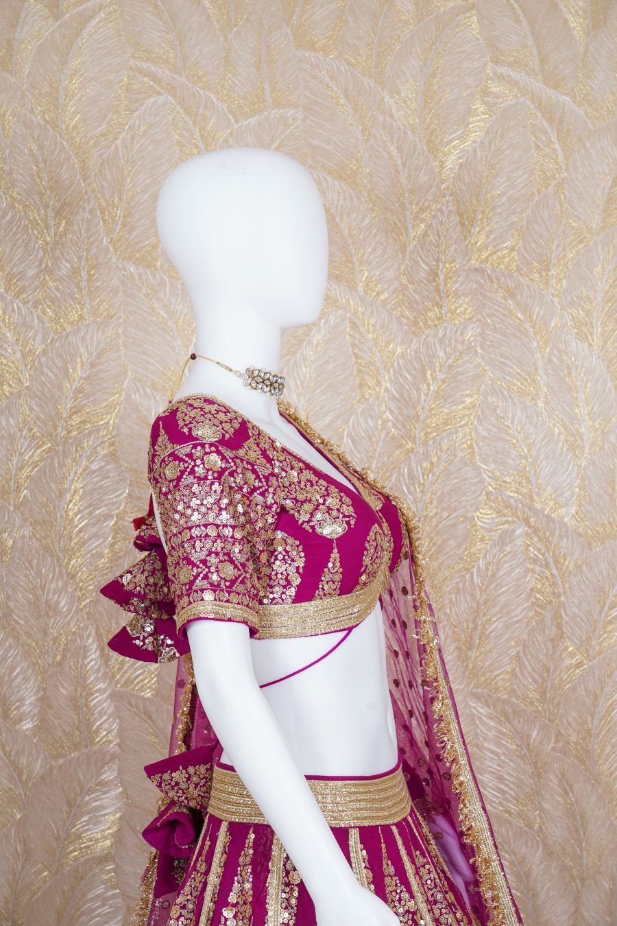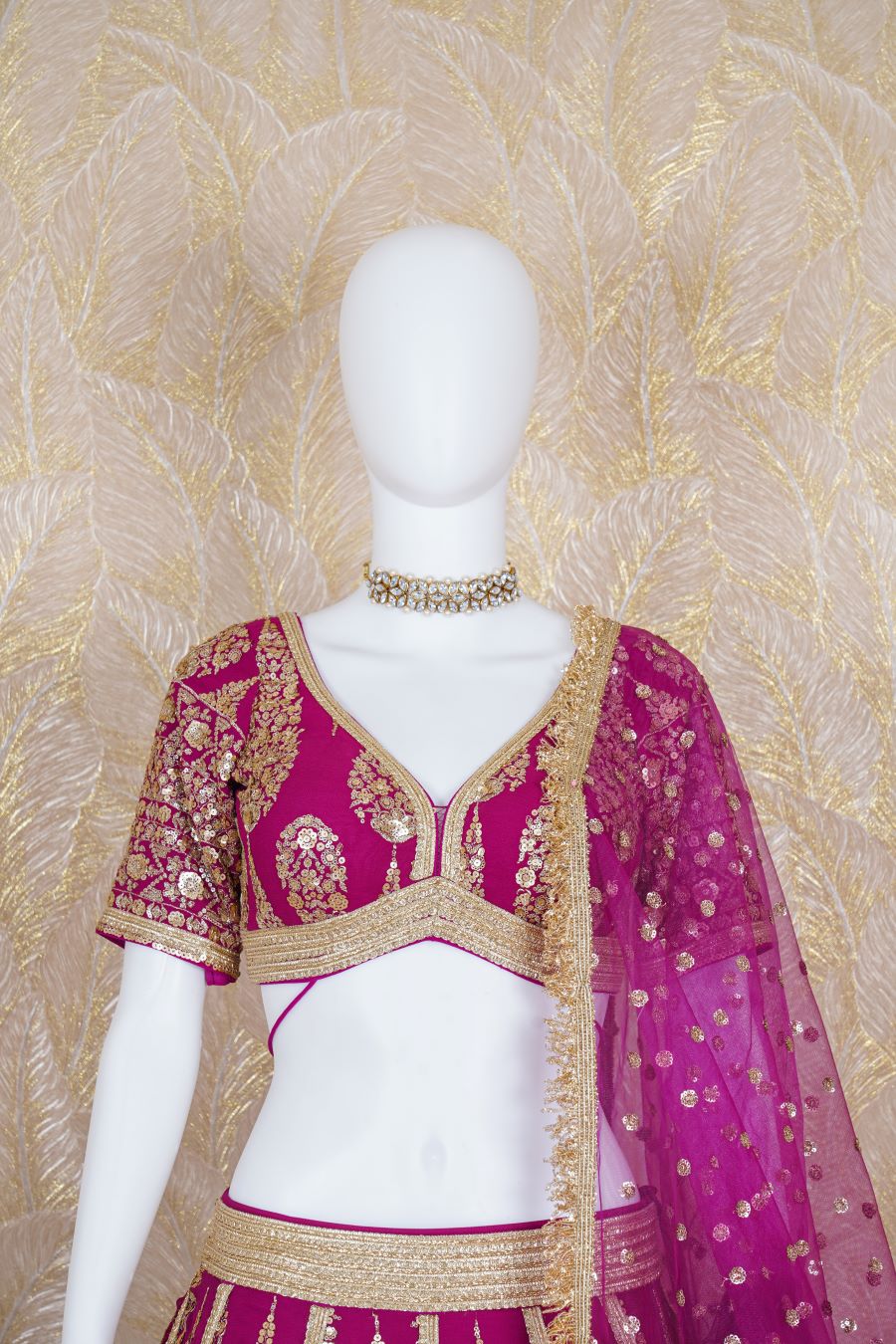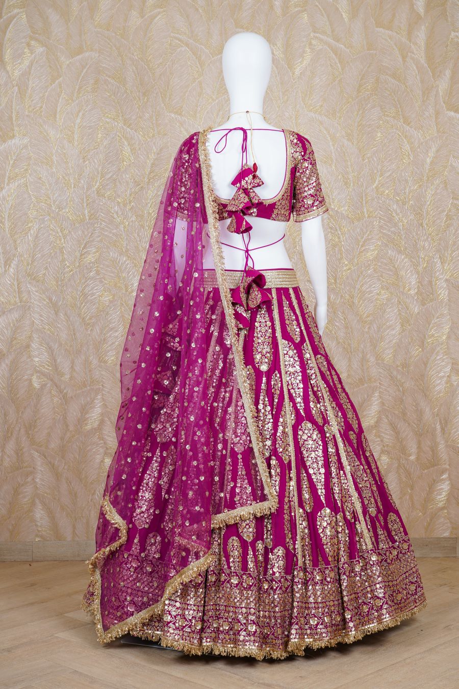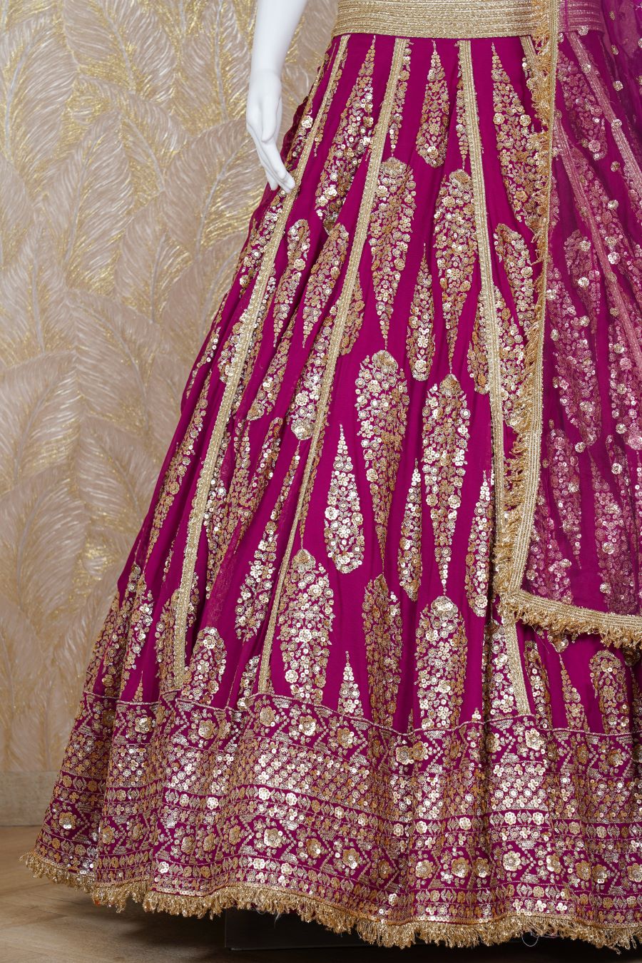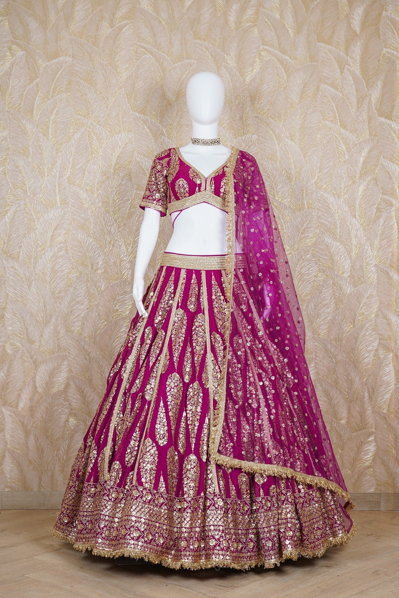 Wine Georgette Lehenga with additional embellishments of golden zari and sequins work with matching work blouse and border work dupatta. Model is wearing size, “Medium”.