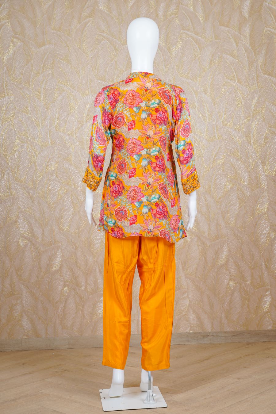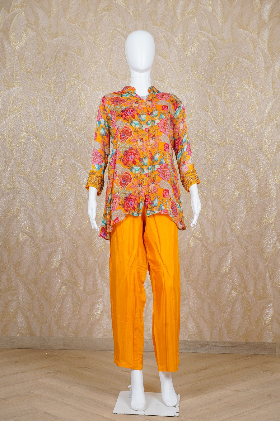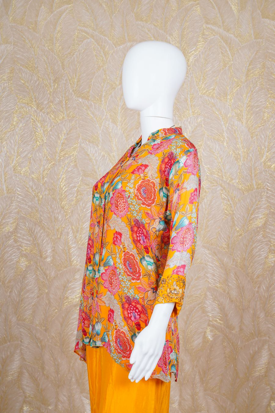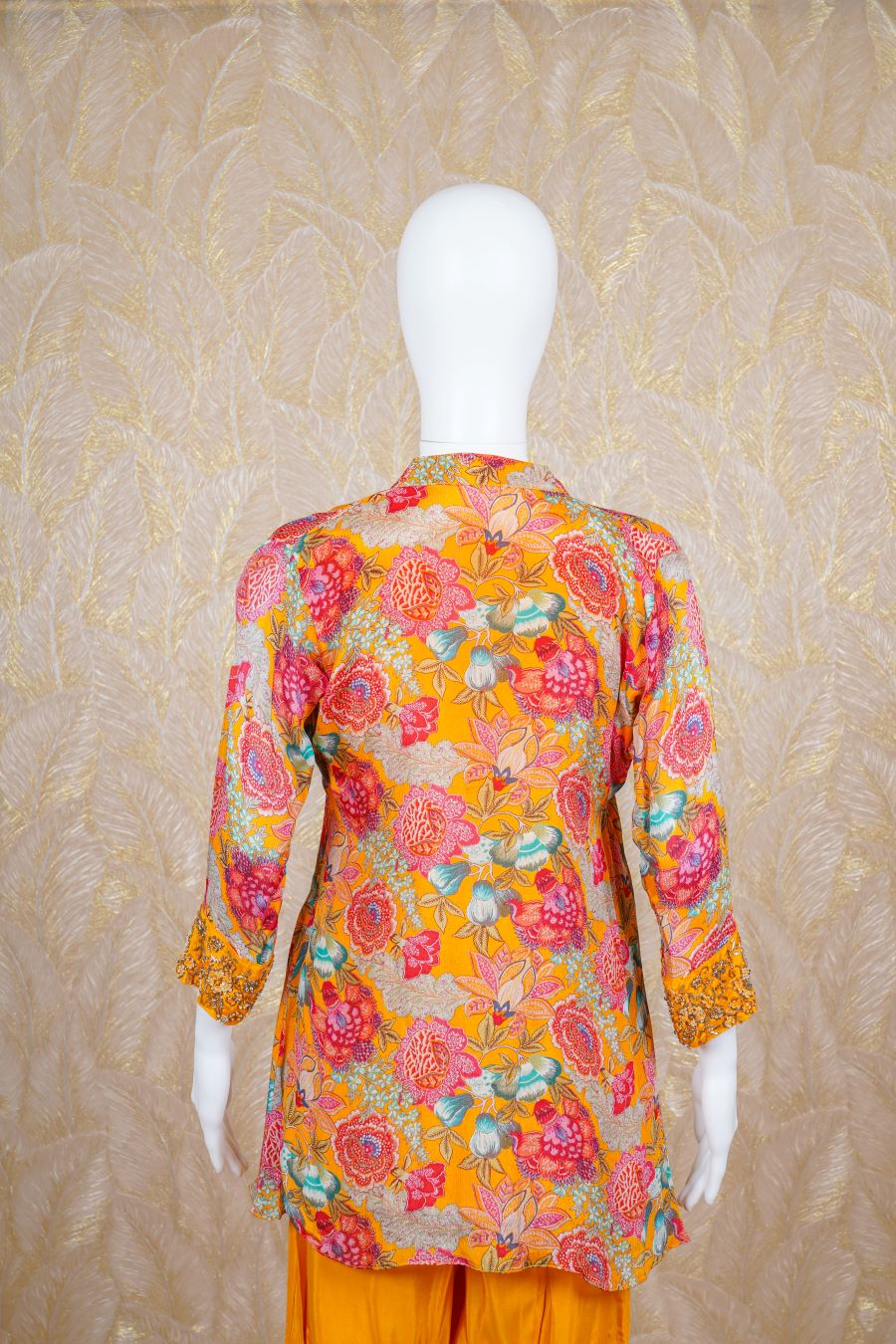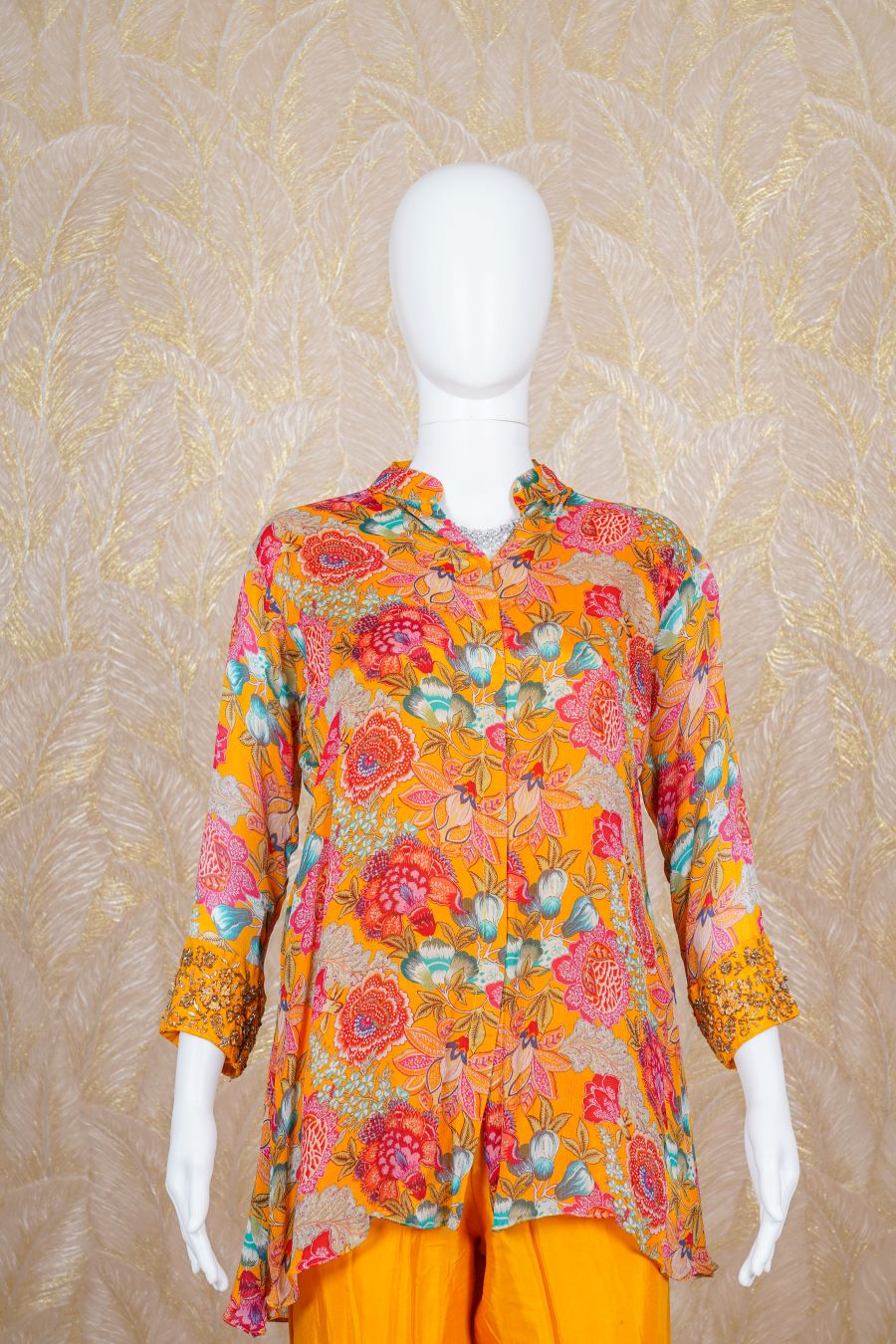 Yellow printed Kurta, long sleeve finished with sequins, zardosi, kardana and beads handcrafted embroidered. Styled with a pants. Model is wearing size, “Medium”.
