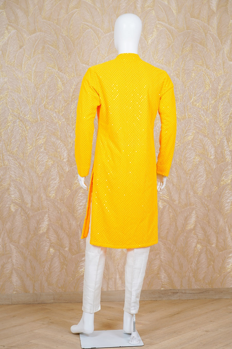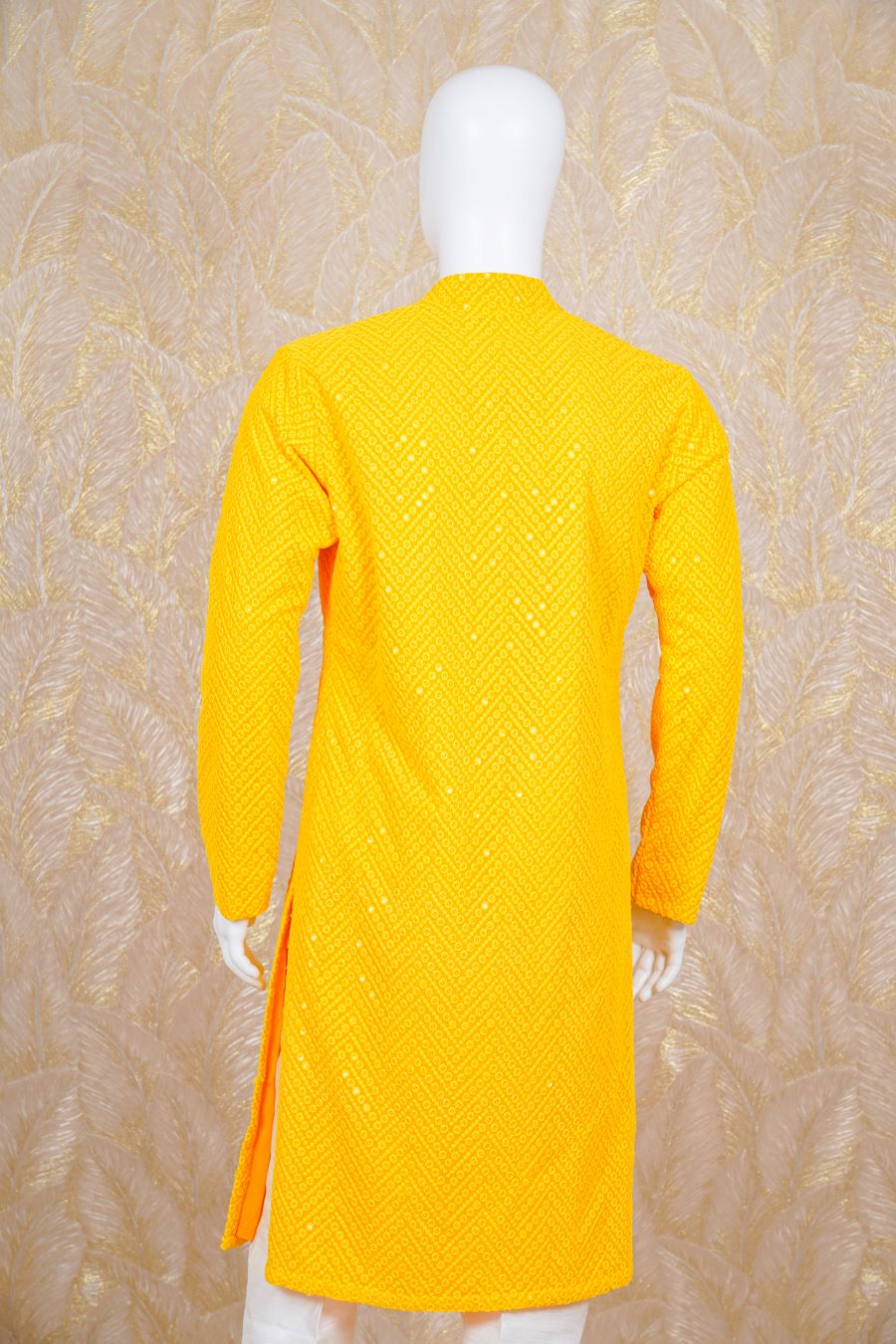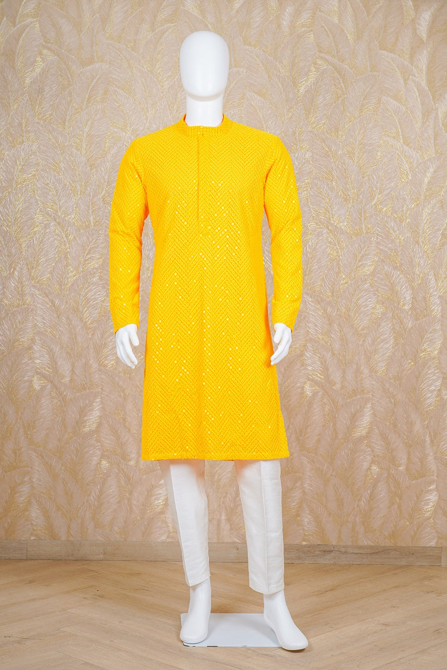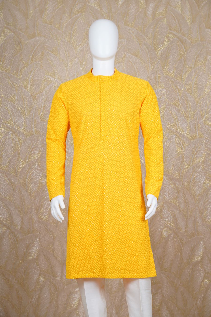 Yellow lakhnavi with front button placket kurta, Styled with a cotton silk trouser. Model is wearing size, “Medium”.