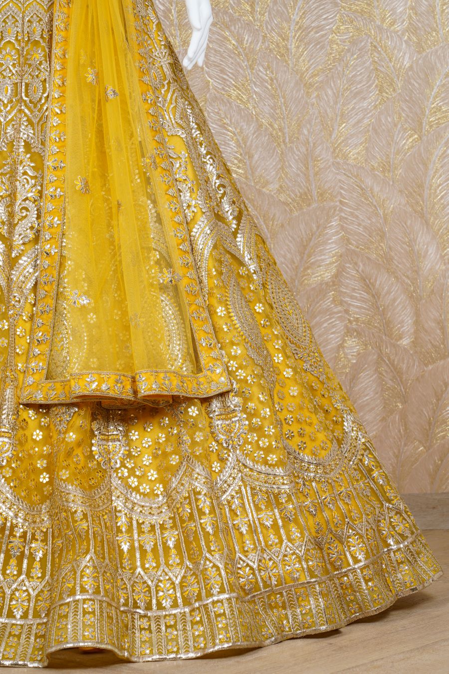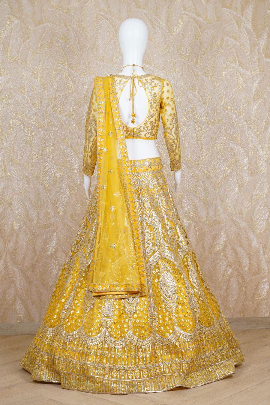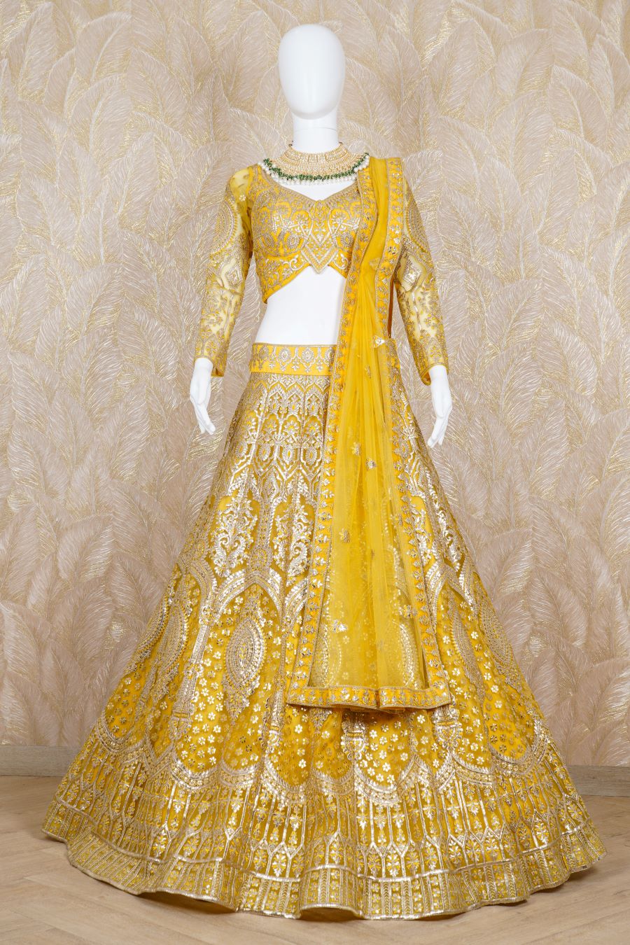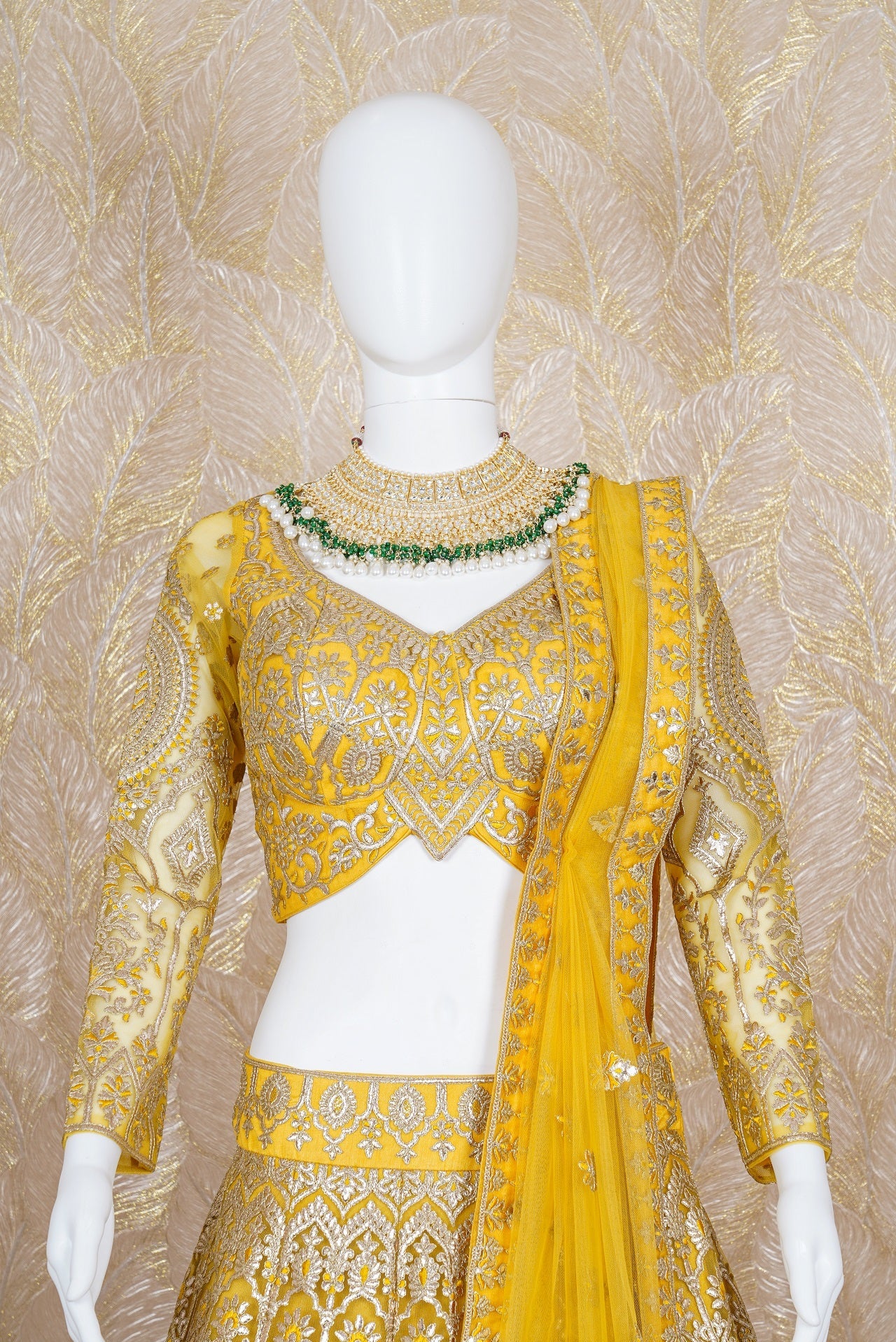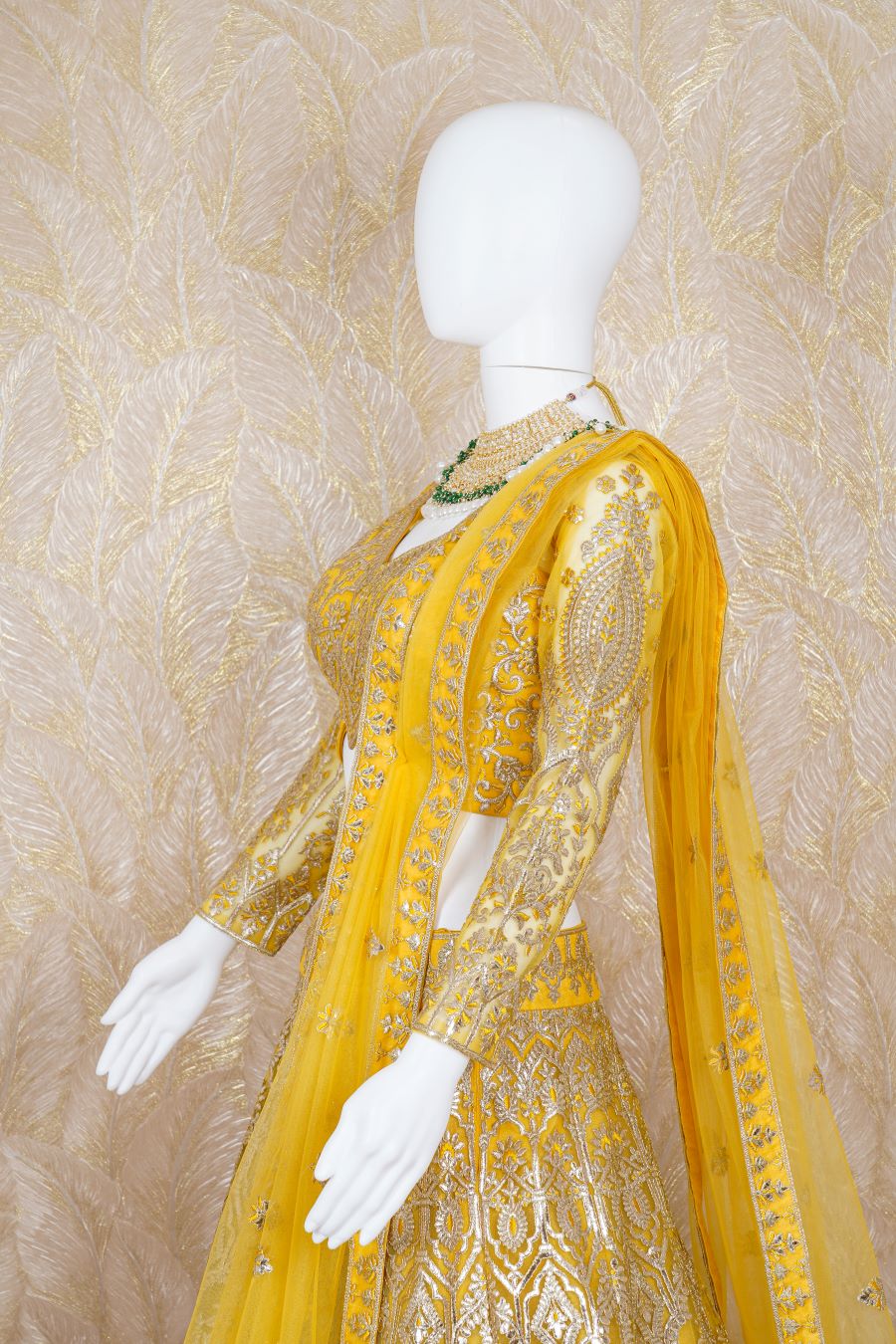 Yellow Tulle Lehenga with adorned resham, fine dori and foil work with handcrafted blouse paired with tulle bordered dupatta. Model is wearing size, “Medium”.