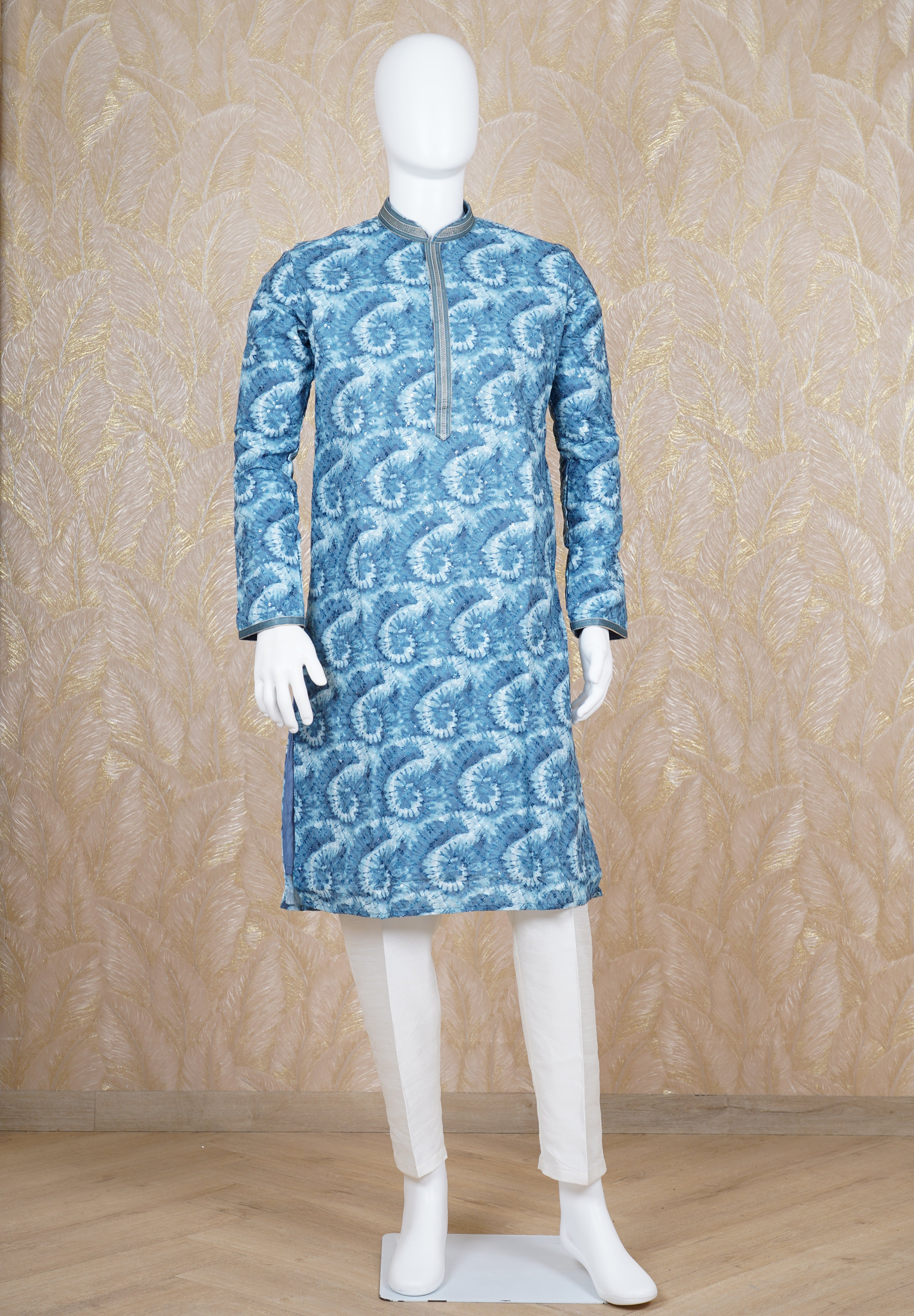 Blue Dupion Silk Kurta embroidered with thread and sequins work. The Kurta is styled with a cotton pants. Model is wearing size, “Medium”.
