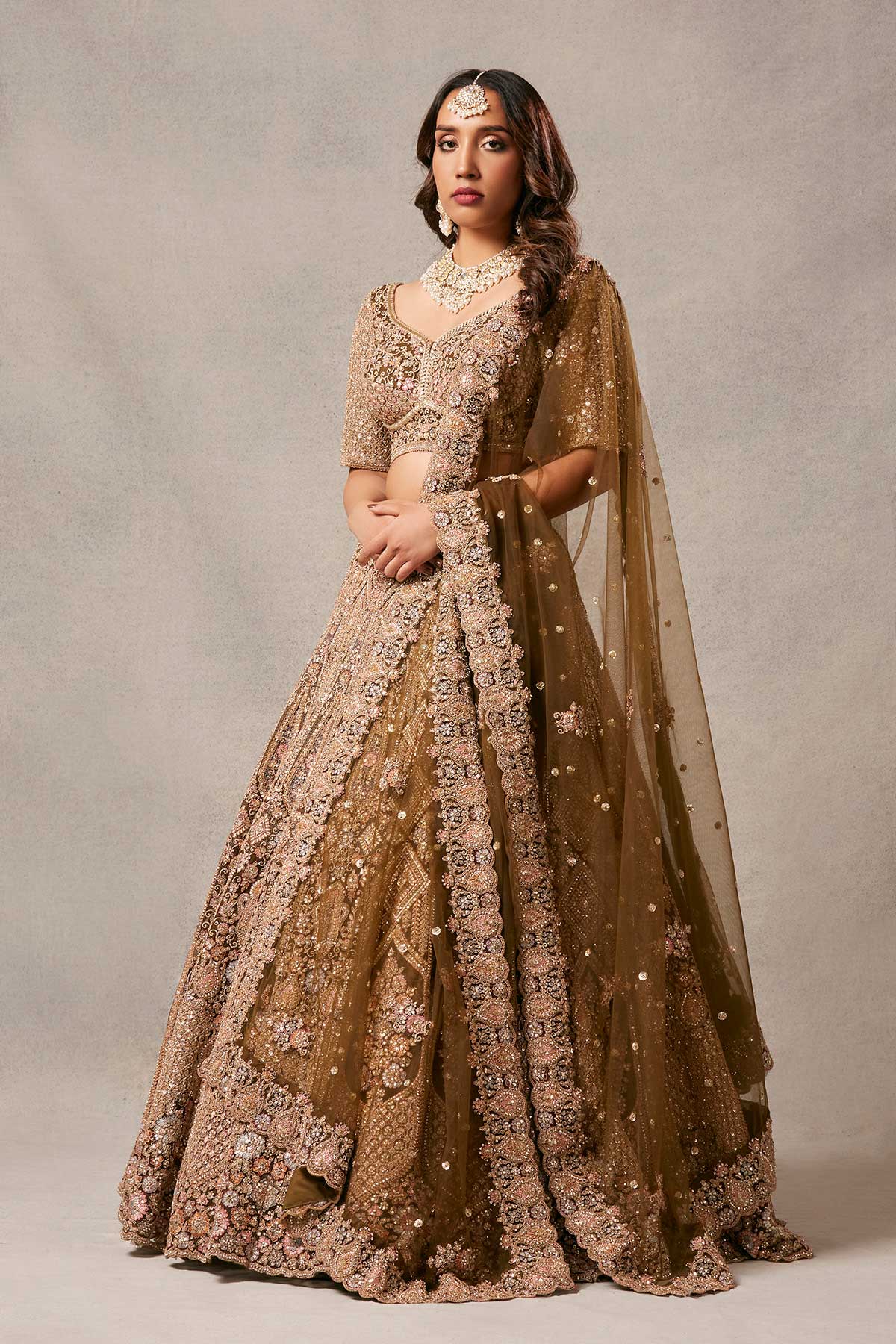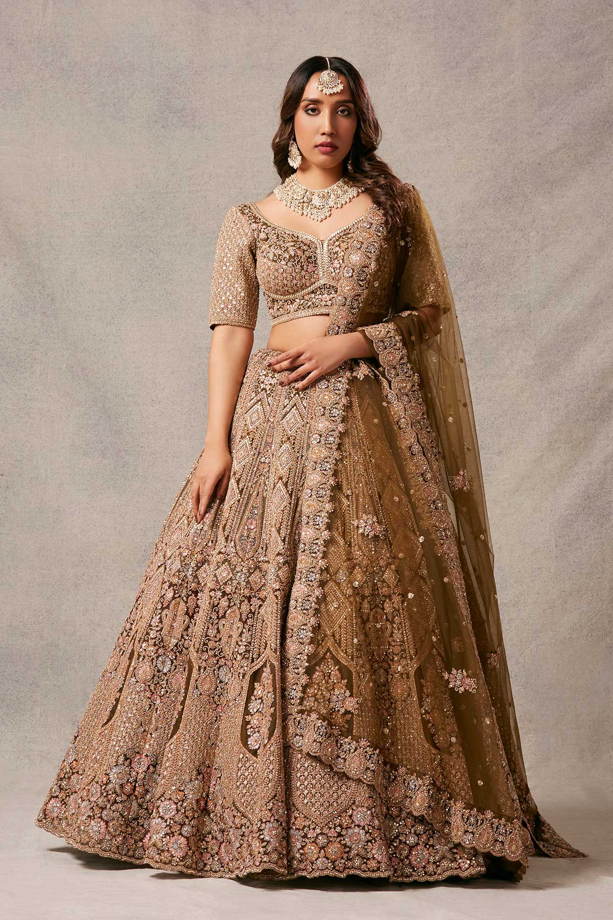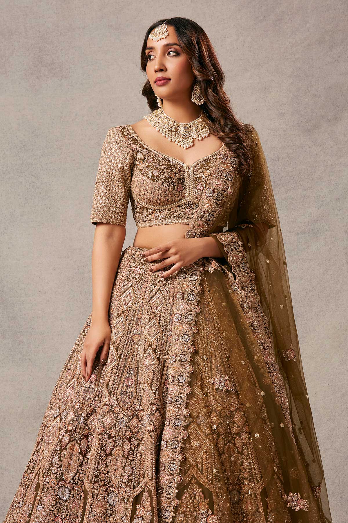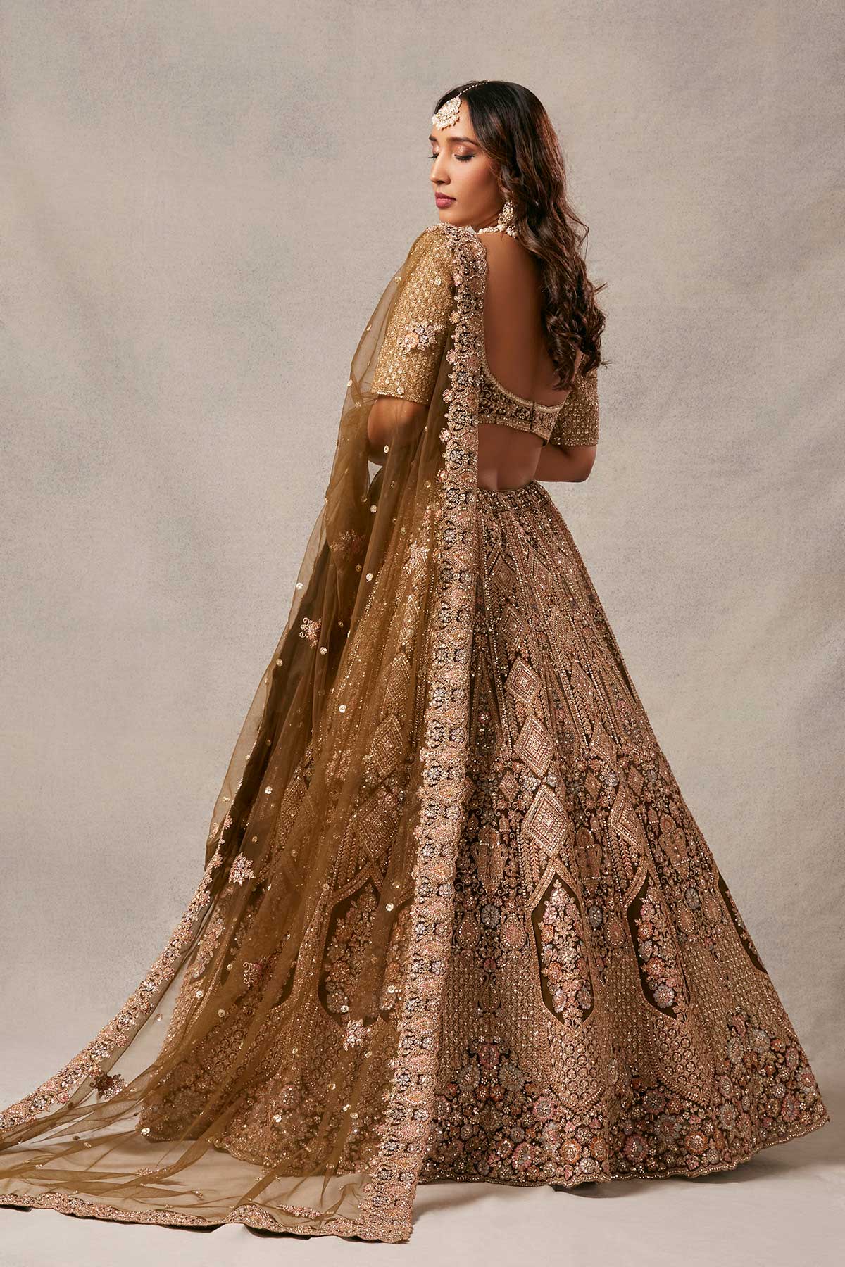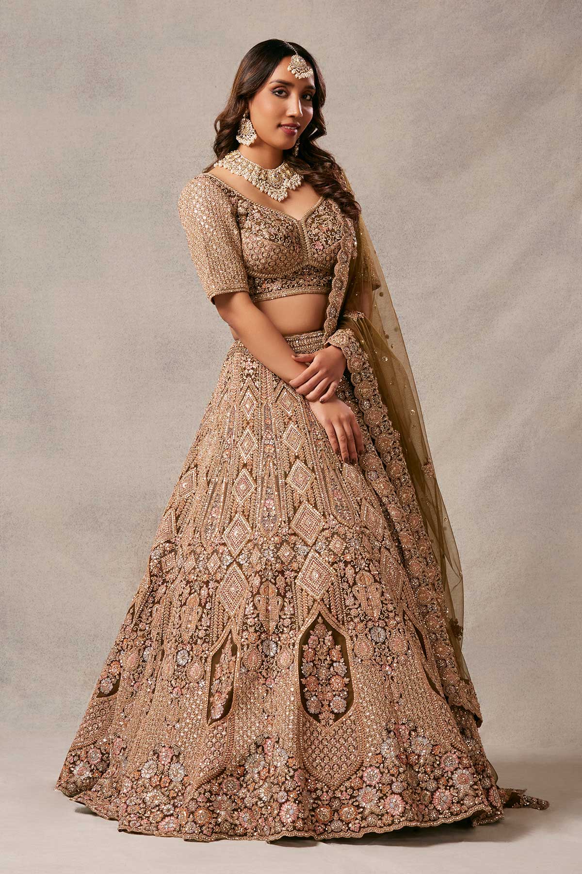 The blouse and lehenga showcase exquisite multicolored zari embroidery, creating a breathtaking and opulent ensemble, complemented by a delicate net dupatta.